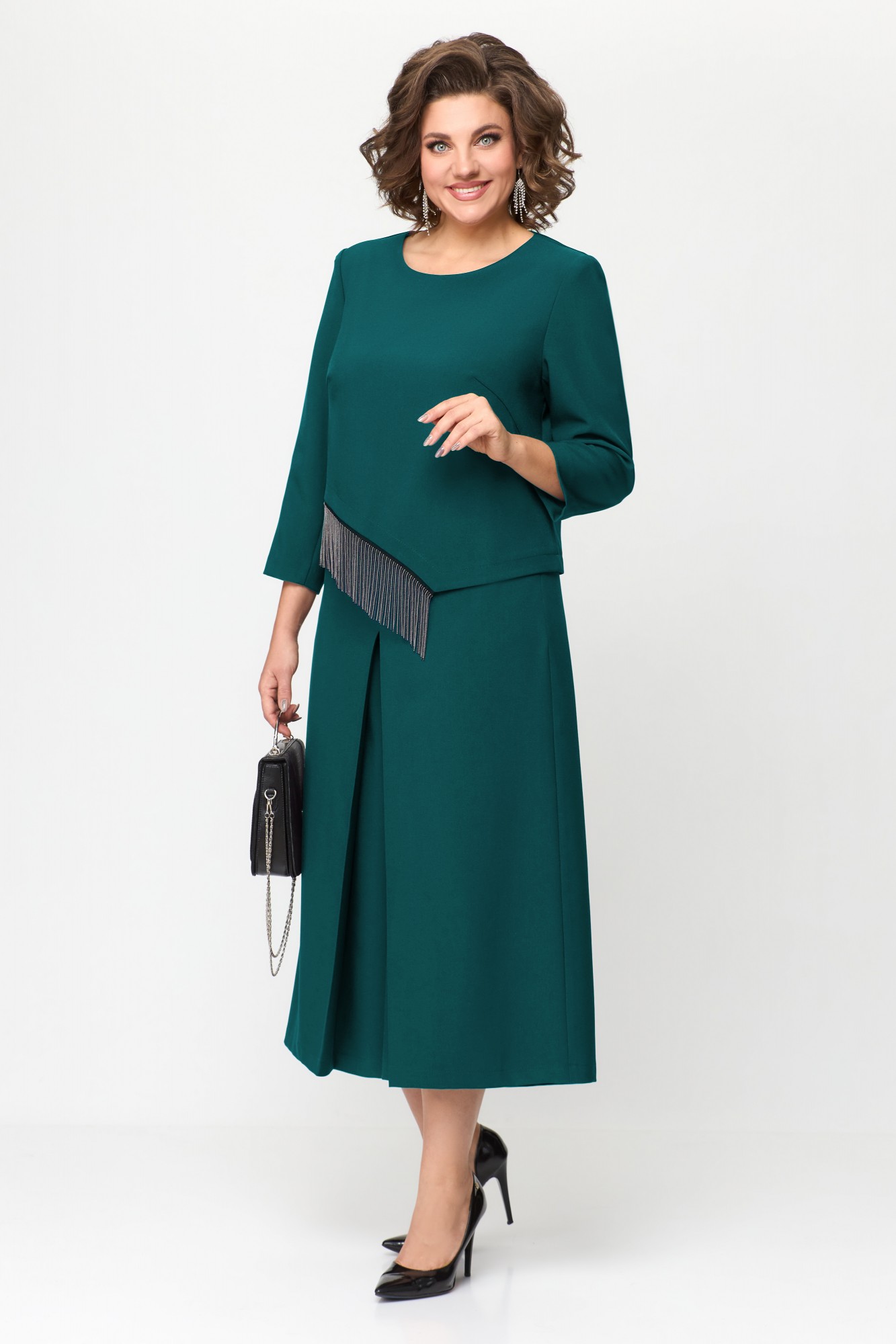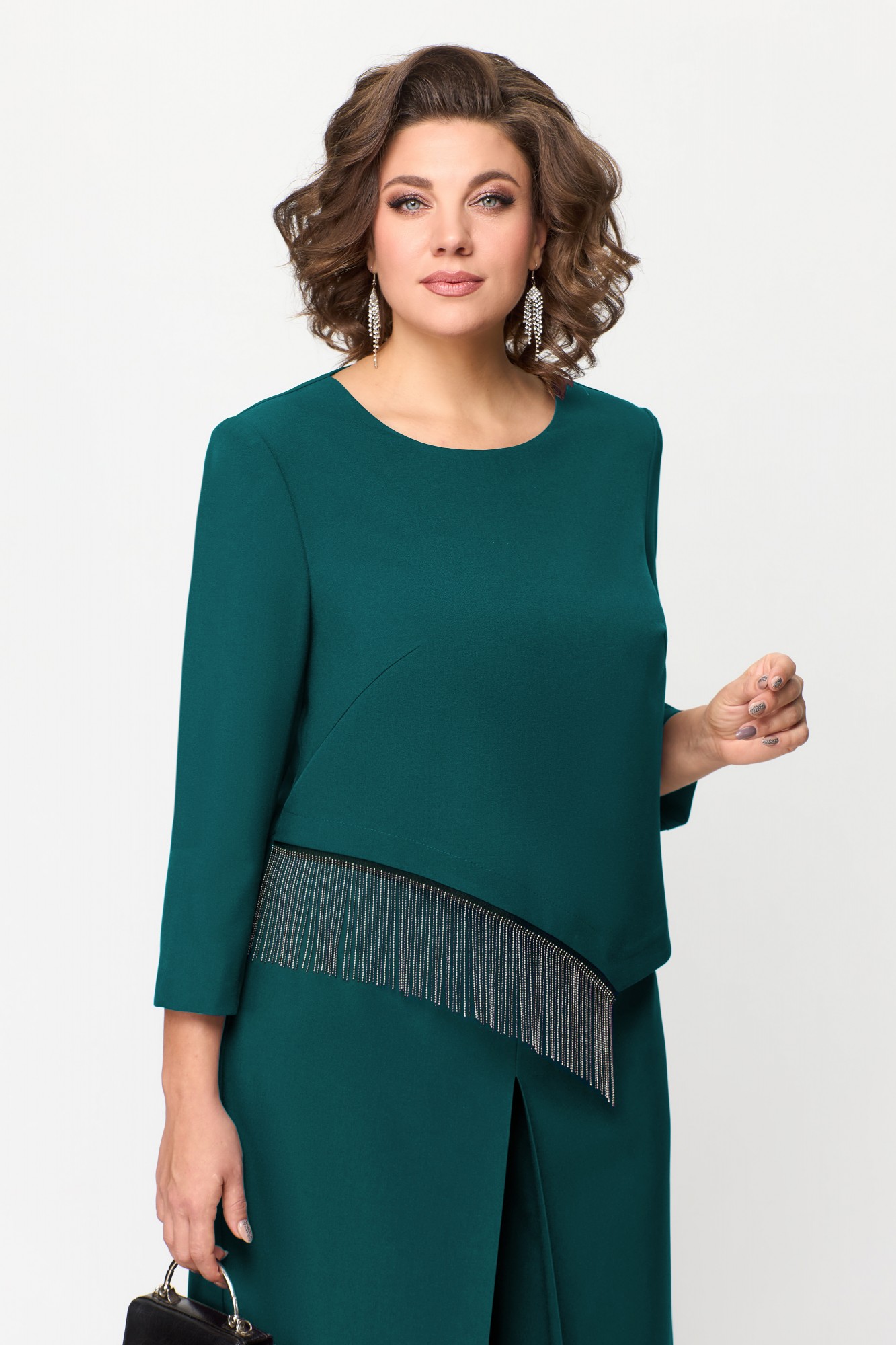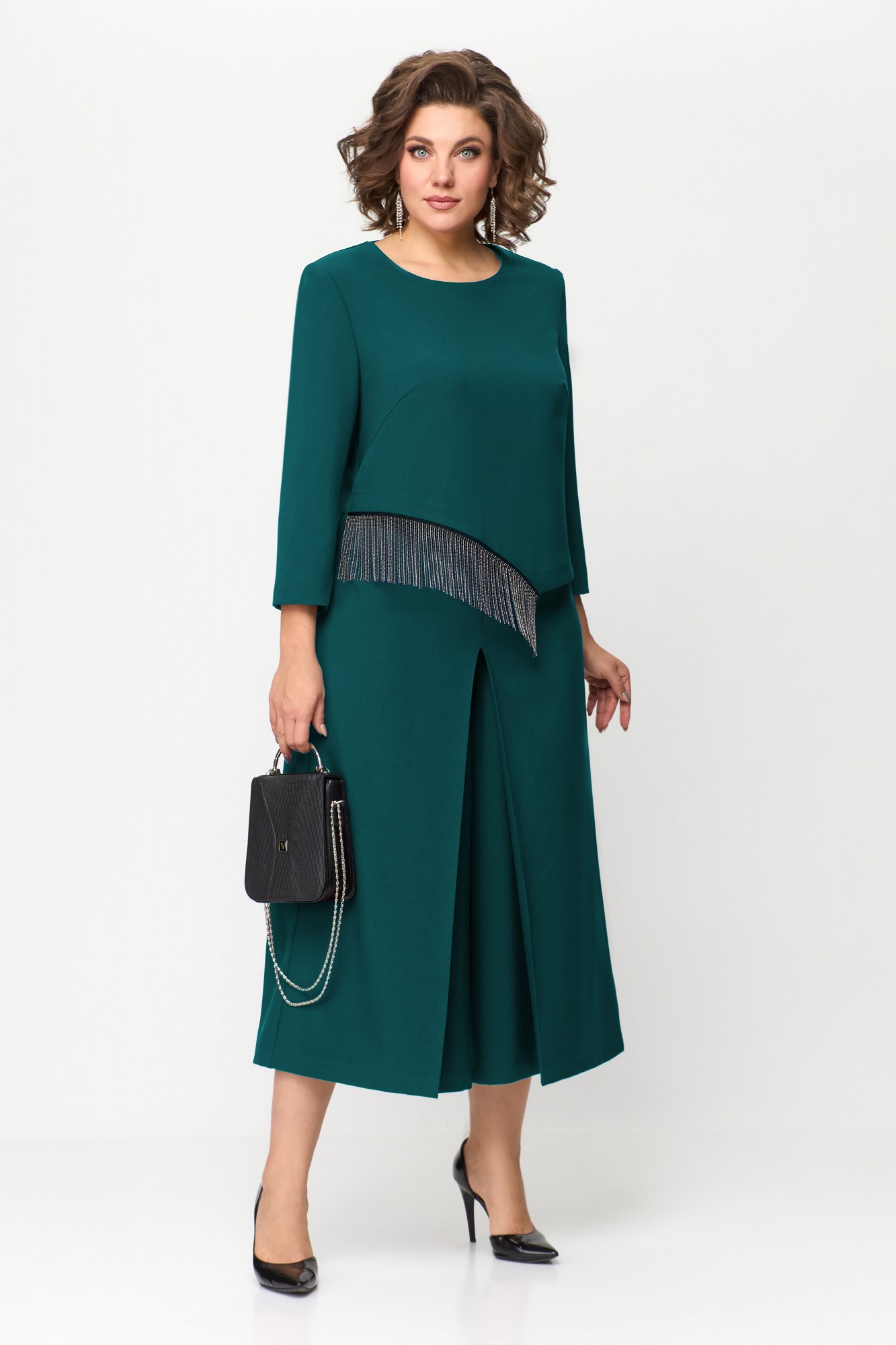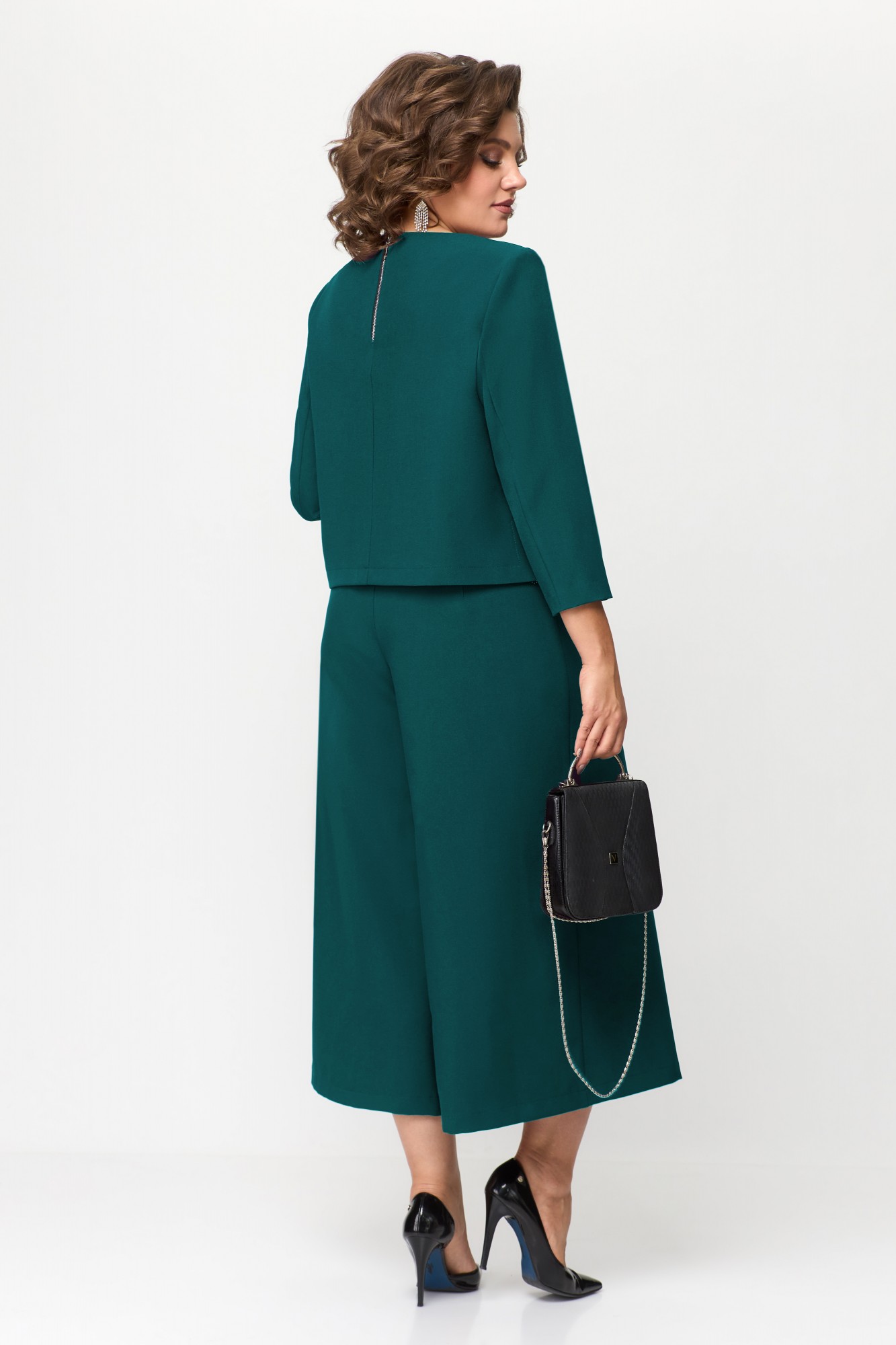Костюм состоит блузы и брюк-кюлотов, выполнен из костюмно-плательной ткани. Блуза прямого силуэта, укороченная, с втачным двухшовным рукавом длинной 3/4.Перед с нагрудными вытачками. Низ ассиметричный с металлизированной бахромой в качестве декора. Спинка с застёжкой на металлическую молнию.