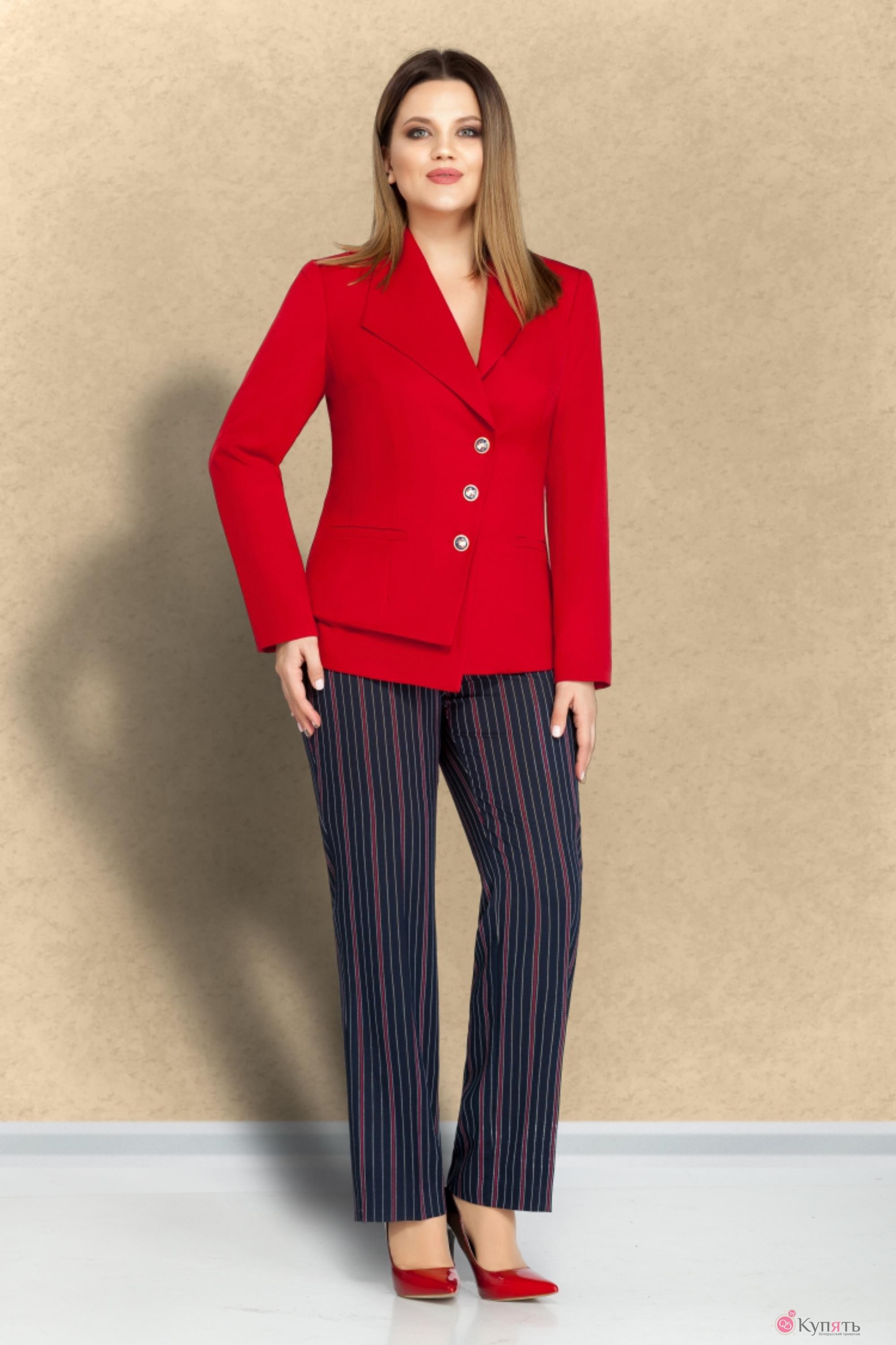 Комплект брючный-двойка, состоящий из жакета и брюк. Яркий деловой комплект. Жакет полуприлегающего силуэта, на подкладке. Воротник ассиметричный отложной. Низ жакета ассиметричный. Перед с отрезными бочками и нагрудными вытачками от них, талиевыми вытачками для полуприлегания к фигуре, с косой застежкой на три петли и пуговицы. На боковых частях переда расположены вертикальные боковые прорезные карманы с листочками. Спинка со средним швом и талиевыми вытачками для полуприлегания к фигуре. Рукав втачной двухшовный. Брюки прямые классические. На задних частях расположенные вертикальные прорезные карманы-обманки с листочками. В поясе брюк частично имеется резинка для прилегания по талии, застежка в брюках на тесьму-молнию.