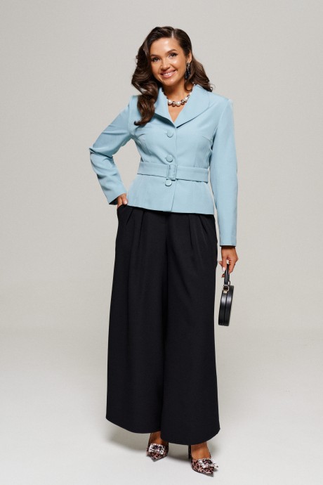 Деловой женский костюм 2-ка, состоящий из 2-х элементов: жакета и брюк. Предназначен для повседневного использования. Жакет выполнен из костюмного, смесового полотна. Жакет однобортный, на подкладке, приталенного силуэта. Передняя часть жакета с двумя подрезными бочками и дополнительными нагрудными выточками. Спинка разрезная по среднему шву с двумя таллиевыми выточками. Рукав длинный, двухшовный, втачной. Воротник пиджачного типа - «апаш». Застежка центральная на три большие пуговицы. В качестве дополнительного декоративного элемента к жакету прилагается пояс на пряжке. Брюки выполнены из костюмно-смесового полотна типа «барби». У нее нежная, гладко-бархатистая фактура, приятная наощупь, и матовая поверхность. Брюки свободного силуэта типа «палаццо». Высота сиденья классическая, средне – высокая. Застежка центральная на молнию с пуговицей. Передняя часть брюк со складками, придающими изделию свободный объем. Брюки на поясе, в задней части которого вставлена резинка для удобного прилегания по талии.