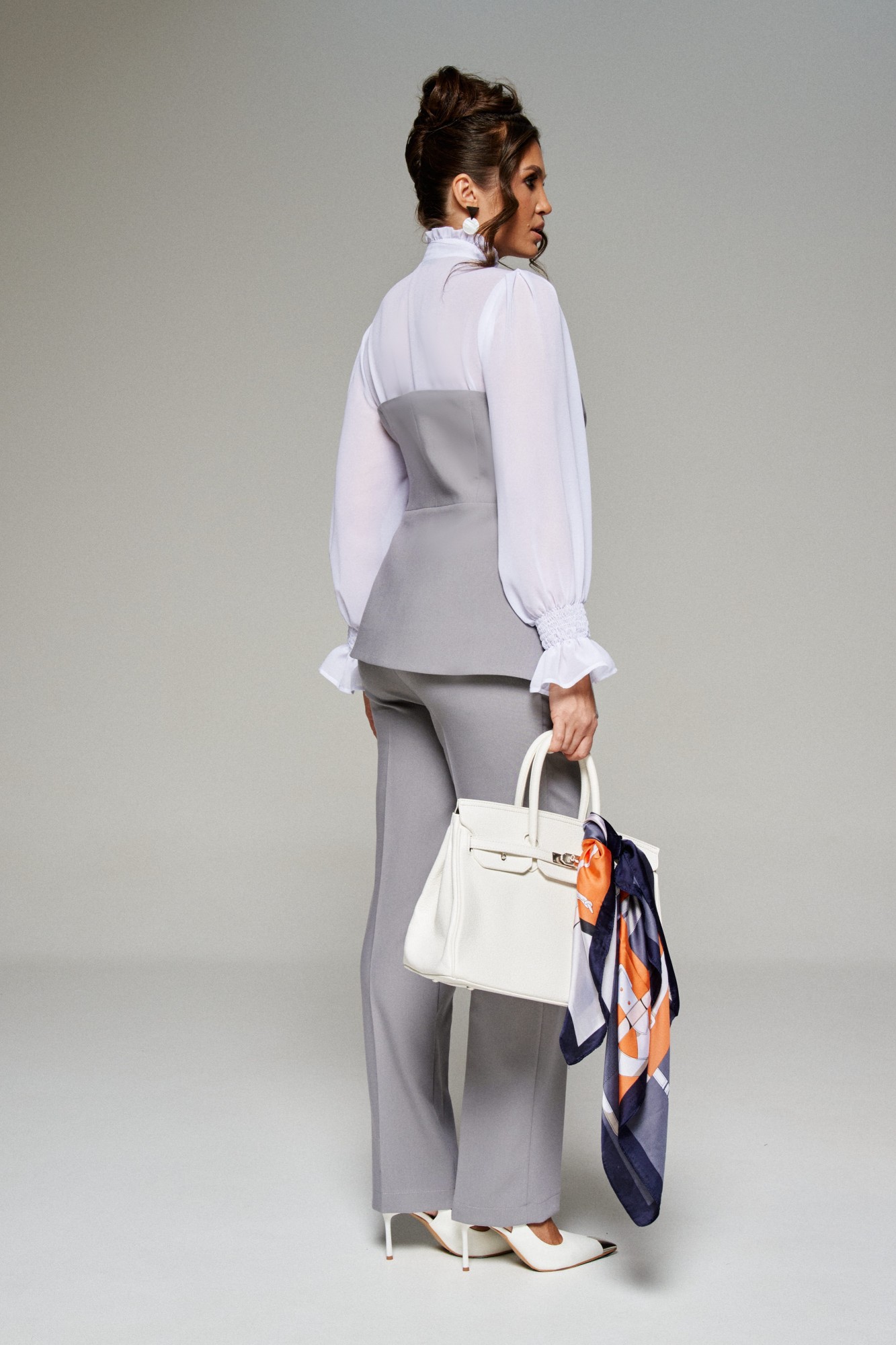 Женственный и в то же время лаконичный образ, который поможет сделать любой день особенным, несомненно можно найти в изысканном комплекте из жилета, имитирующего корсет с романтической блузкой, и элегантных брюк. Выполнен в комбинации из костюмно-смесового полотна с нежной, бархатистой фактурой, приятной на ощупь и матовой поверхностью и полупрозрачного невесомого и необыкновенно нежного шифона.