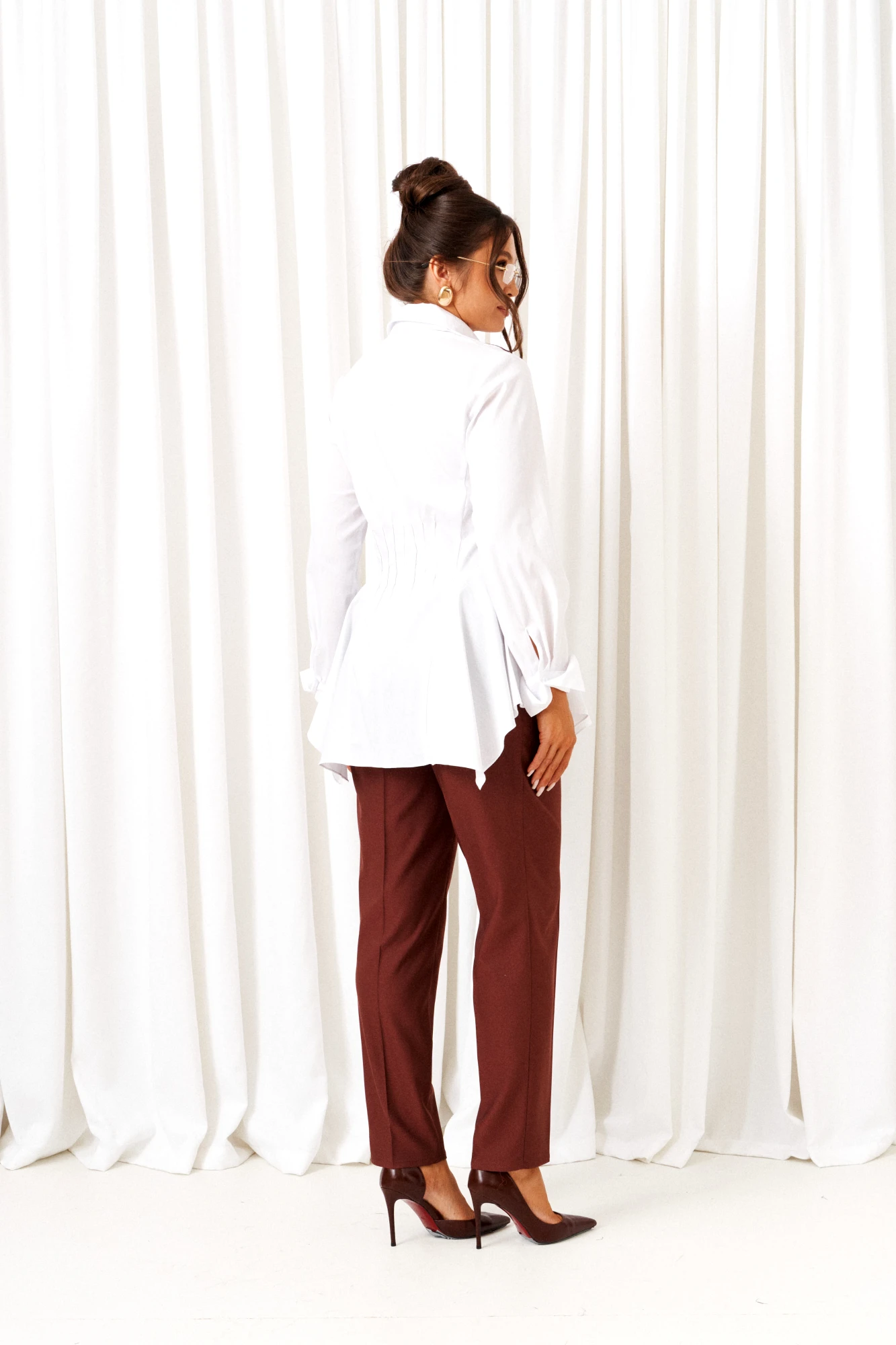 Брюки классические, длиной до щиколотки, слегка заужены внизу, с высокой посадкой.