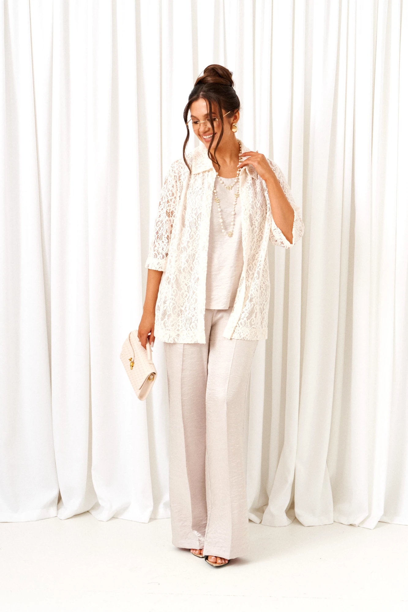 Комплект с блузкой из кружева, брюк и топа – изделие вне времени и трендов, созданное в различных интерпретациях: от оверсайза до классики. Предназначен для повседневного и выходного использования. Найдет применение в любую погоду.