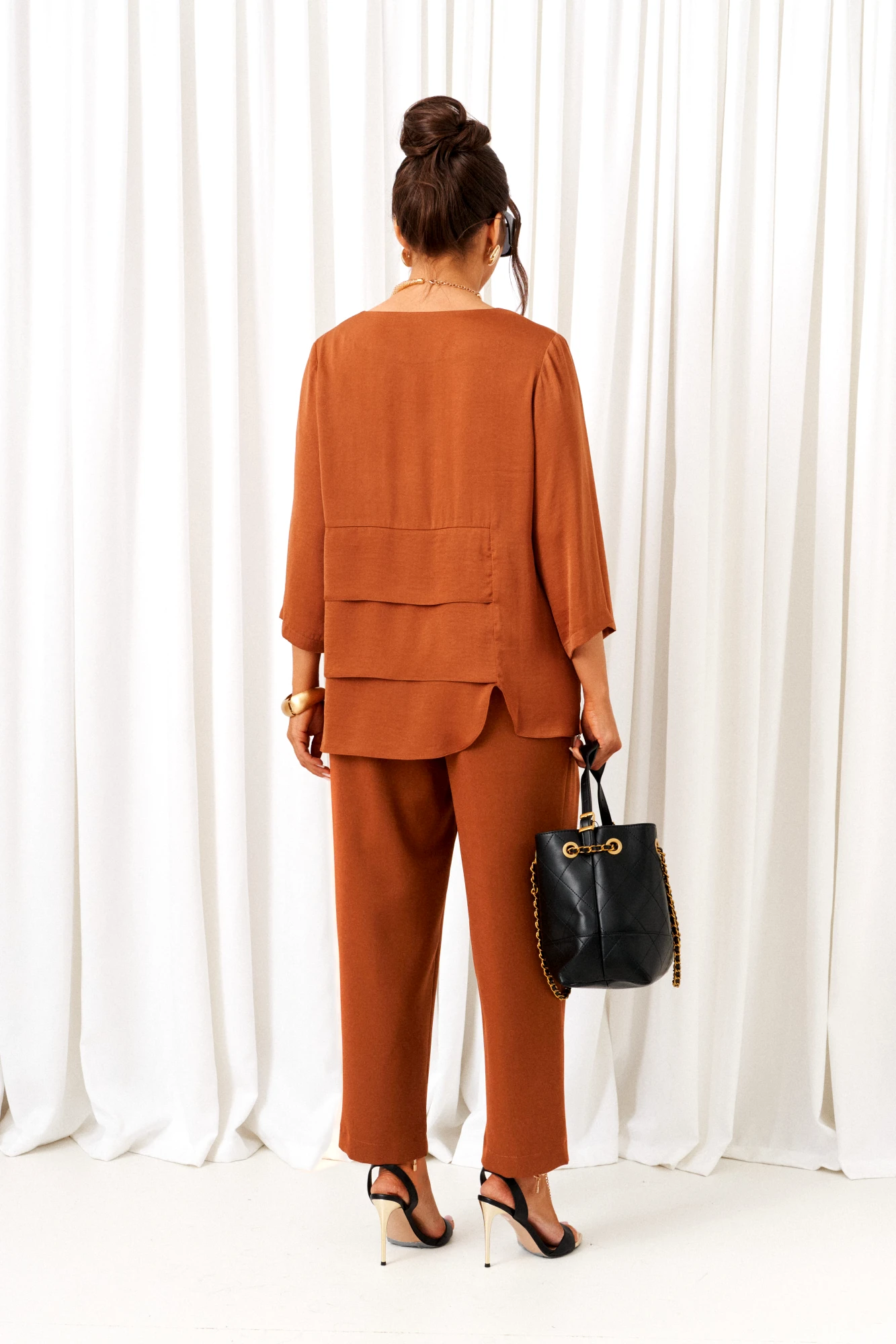 брюки - вискоза 60%, пэ 37%, спандекс 3%, блузка – вискоза 50%, пэ 50%