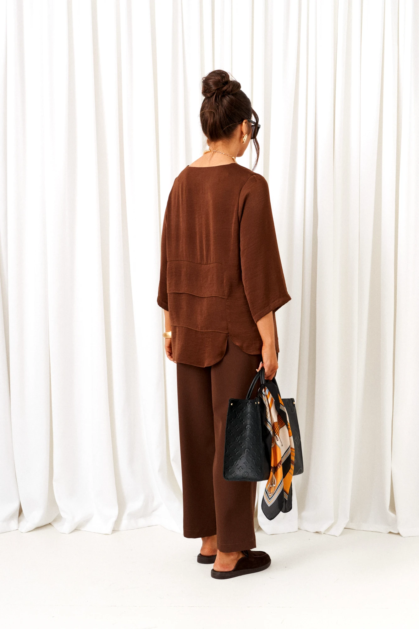 брюки - вискоза 60%, пэ 37%, спандекс 3%, блузка – вискоза 50%, пэ 50%