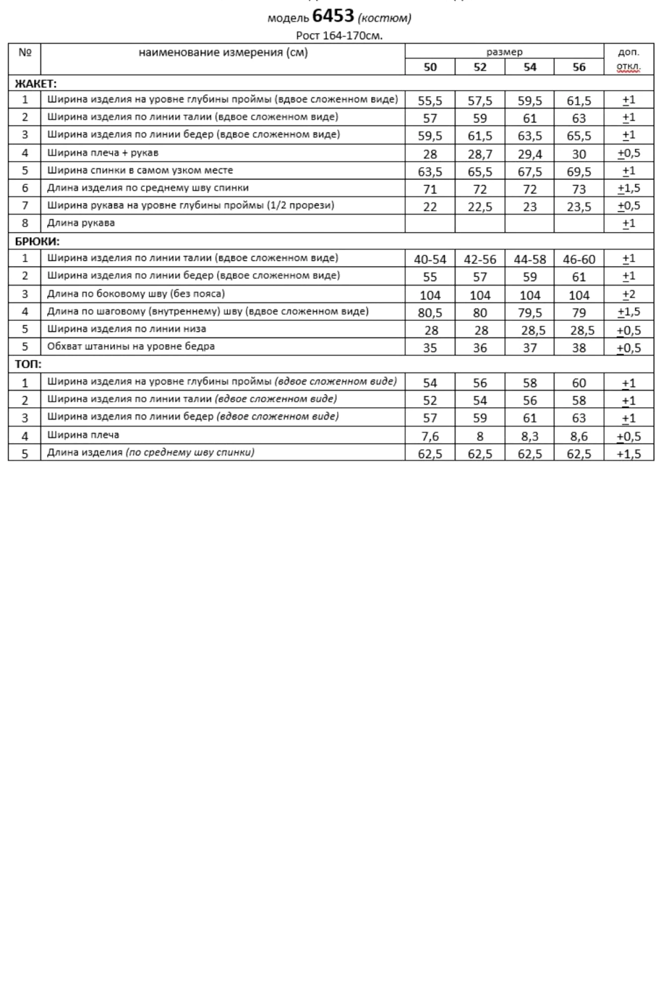 Таблица измерений