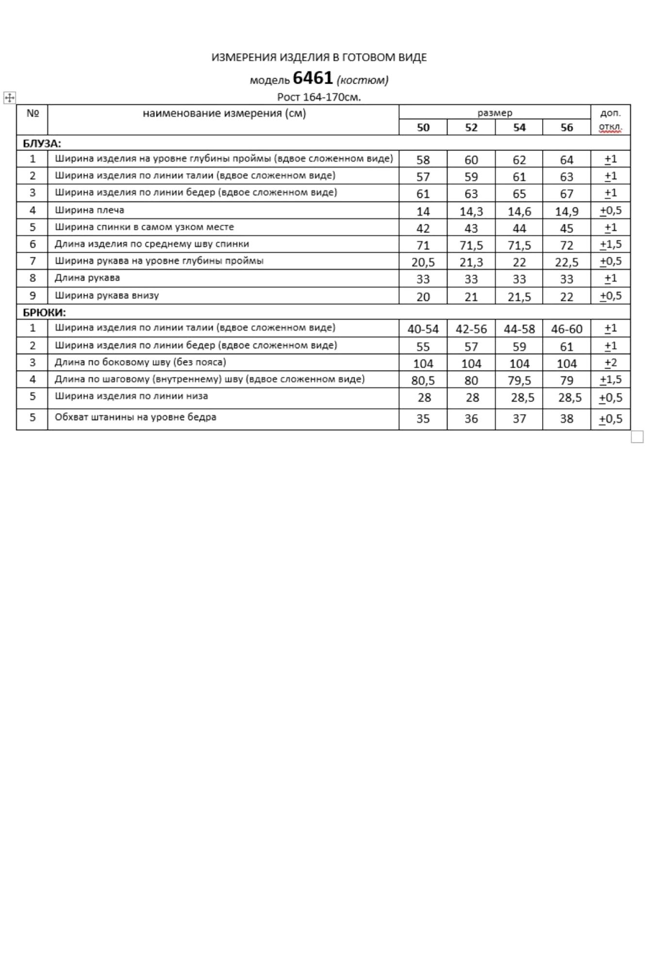 Таблица измерений