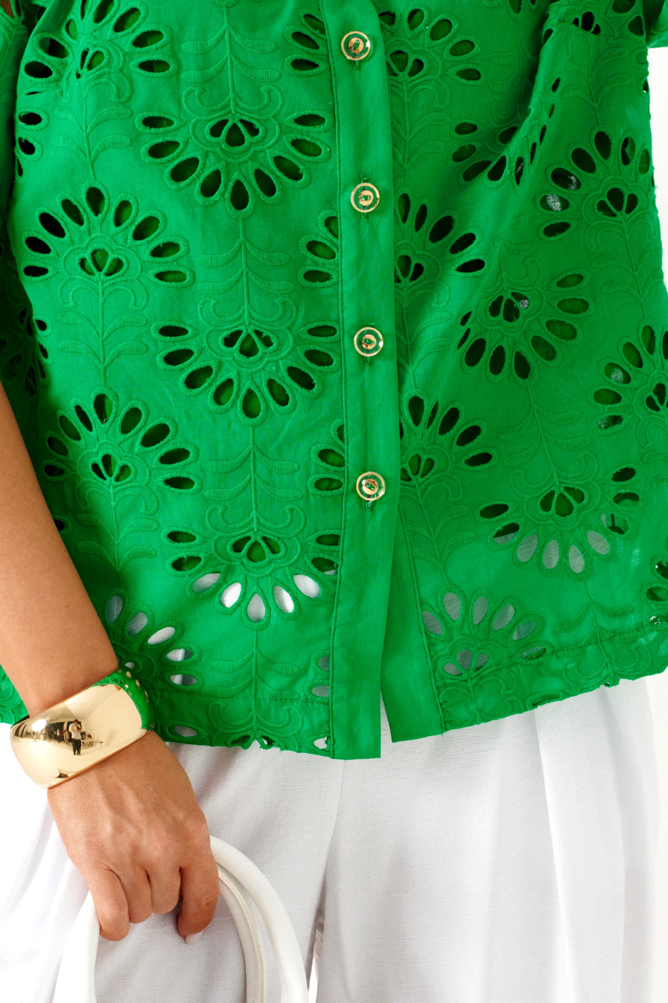 Низа блузки и рукавов ровный. Планка блузки выполнена из однотонной ткани соответствующего цвета. Перед блузки на хлопковой подкладке.