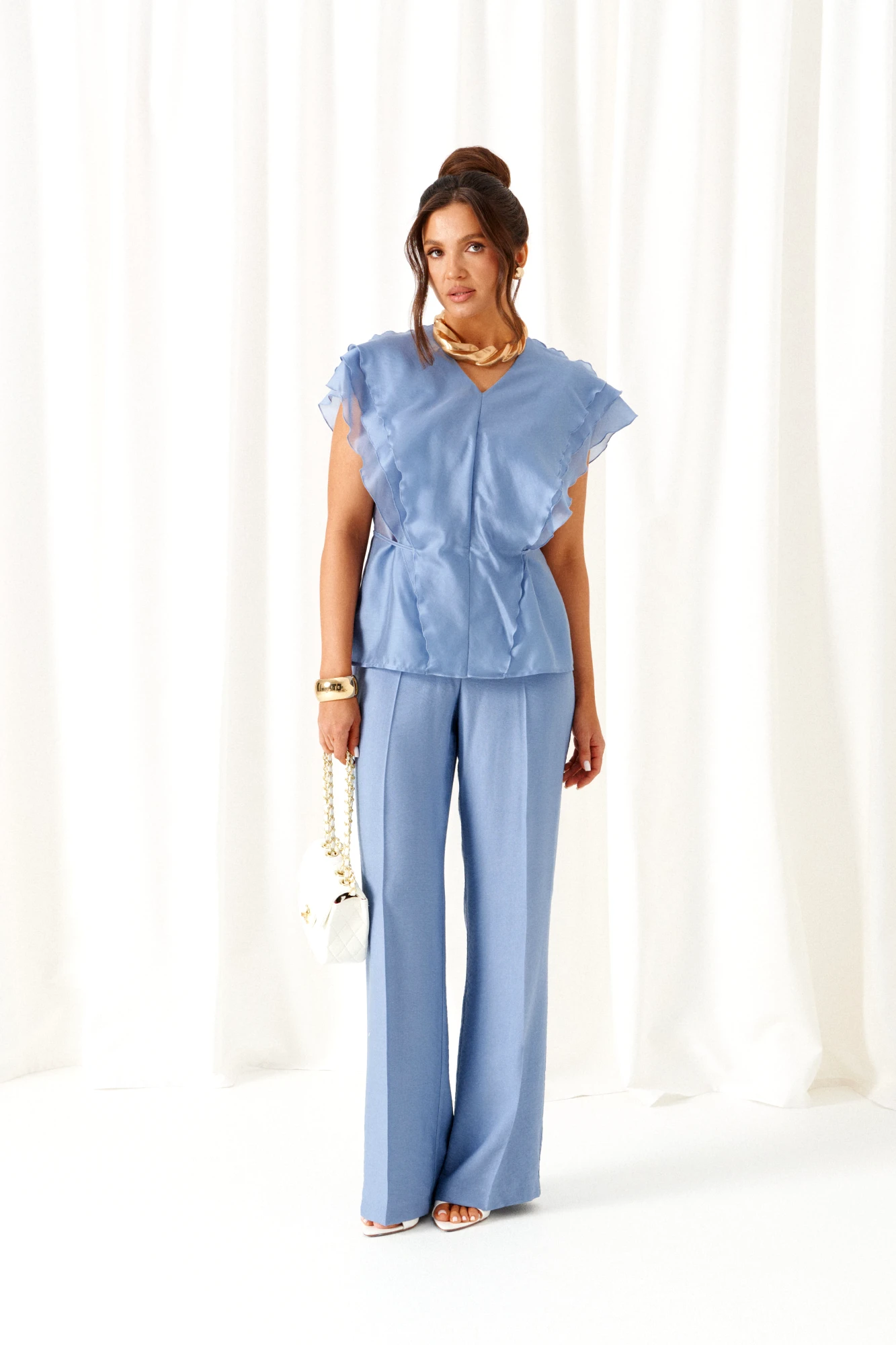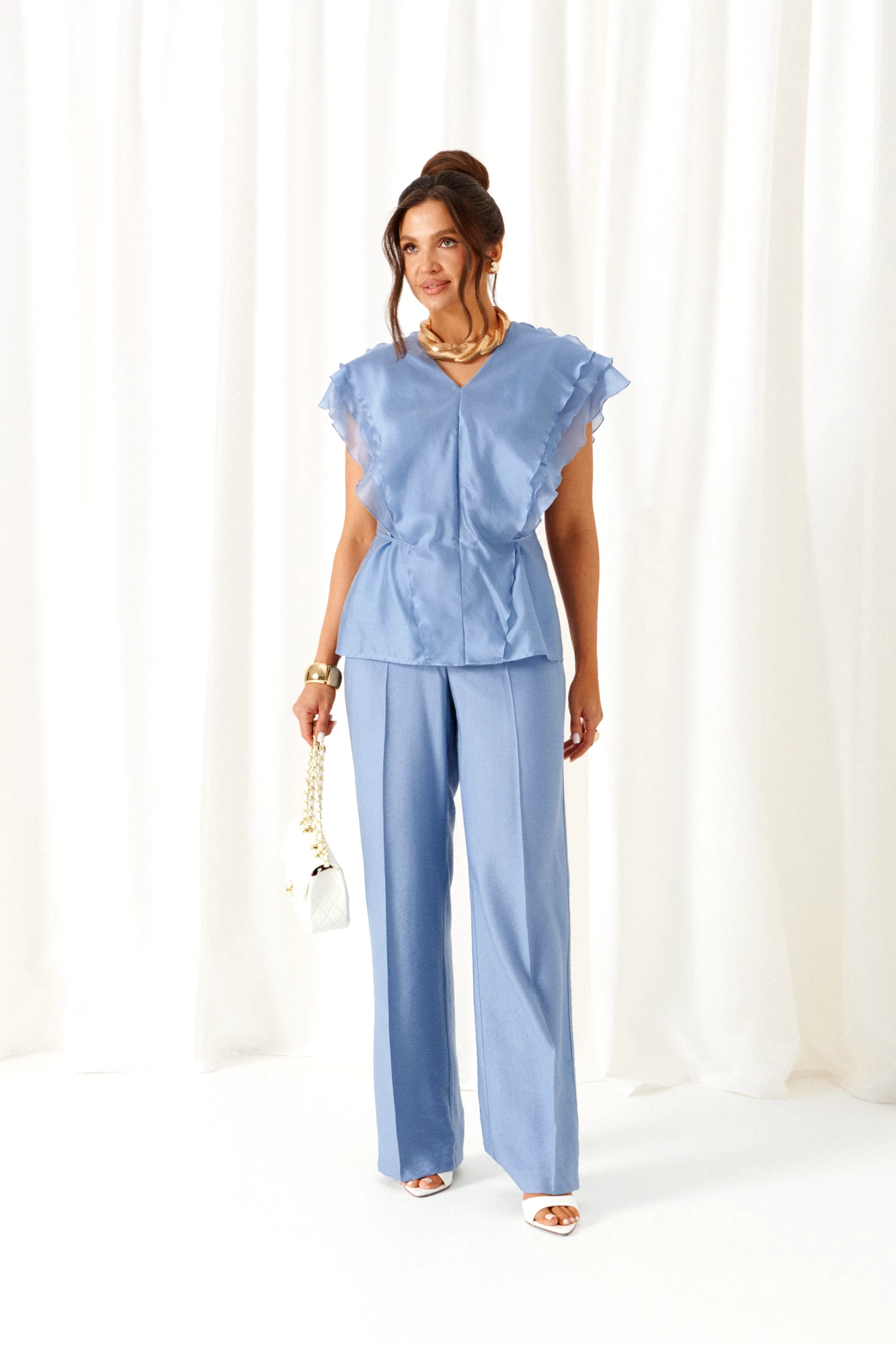 Блузка – вискоза 87%, нейлон 13%. Брюки - лен 80%, вискоза 20%