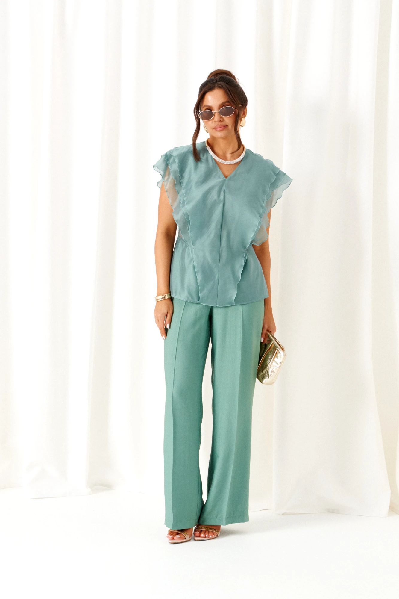 Блузка – вискоза 87%, нейлон 13%. Брюки - лен 80%, вискоза 20%