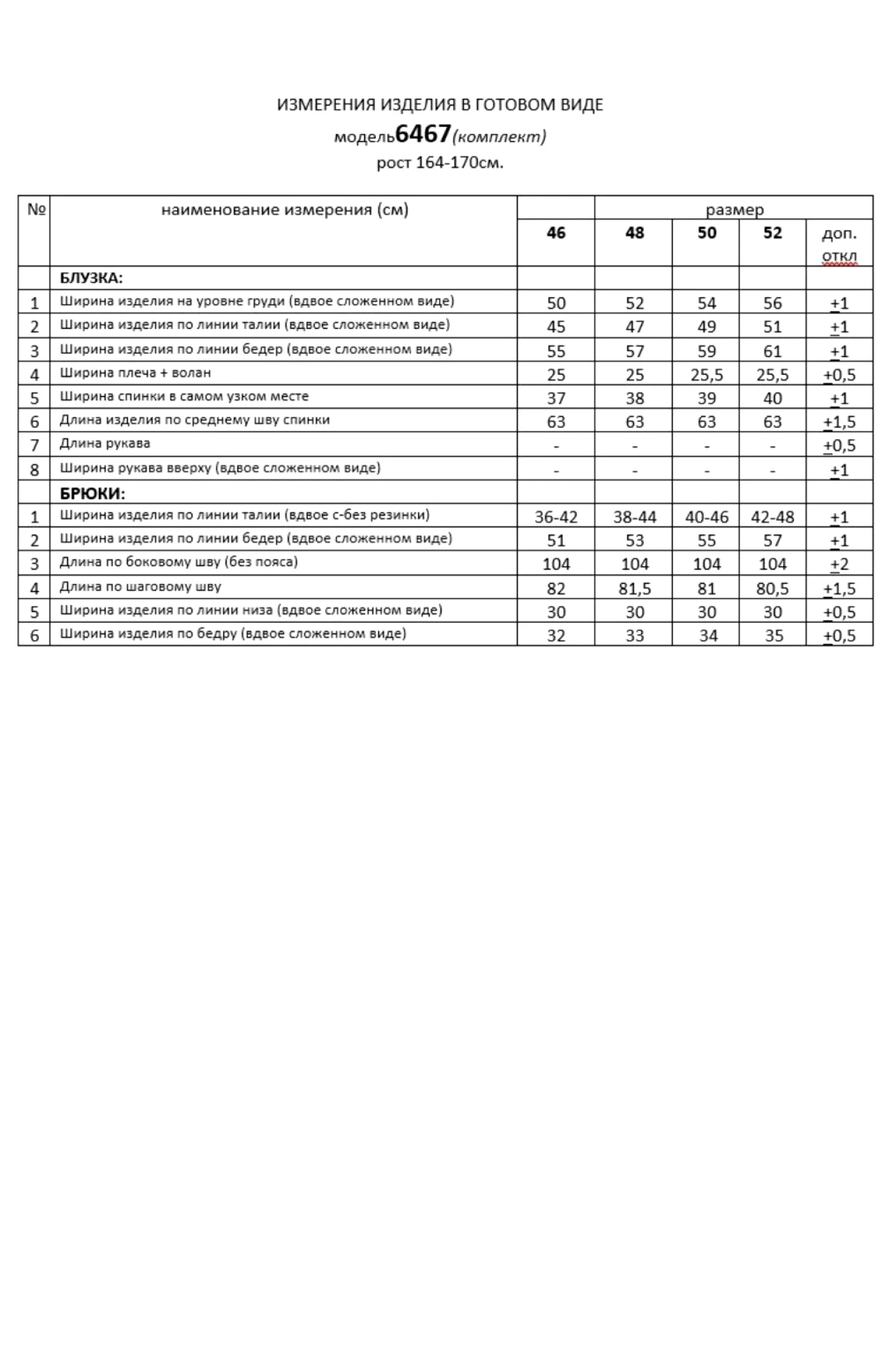 Таблица измерений