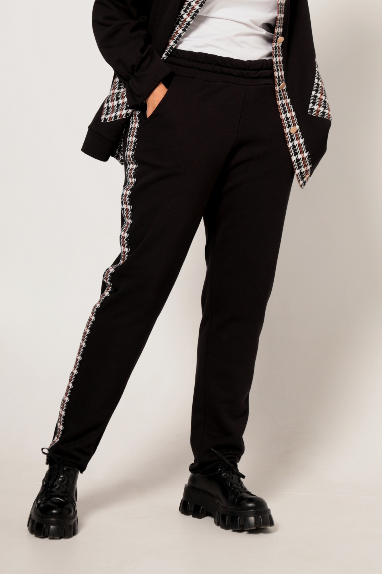 Комплект женский, состоящий из бомбера и брюк. Выполнен из двух видов ткани, хлопковый трикотаж + костюмная ткань. Стильная и трендовая расцветка состоящая из дополнительных вставок из гусиной лапки и декорирована золотистыми элементами. Контрастные настрочные карманы на передней части на фоне черного трикотажа добавляют модели особый интерес окружающих взглядов. Горловина обработана втачным воротником с необычной обработкой. Верхний воротник настрочен на нижний, при это нижний воротник имеет свободный срез. Рукав со спущенной проймой и по низу имеет свободный срез, обработанный на плоскошовной машине и частично обработан резинкой, которая собирает рукав в элегантную "юбочку". Перед имеет застёжку на петли-пуговицы. Брюки с лампасами из гусиной лапки, что сочетает между собой данный комплект. Брючки имеют хорошую посадку за счёт отрезной кокетки по задней части. В боковых швах имеются карманы с отрезным бочком. Низ брюк, так же обработан нестандартным способом на плоскошовной машине с открытым срезом. Такая обработка предохраняет срез ткани от дальнейшего осыпания.