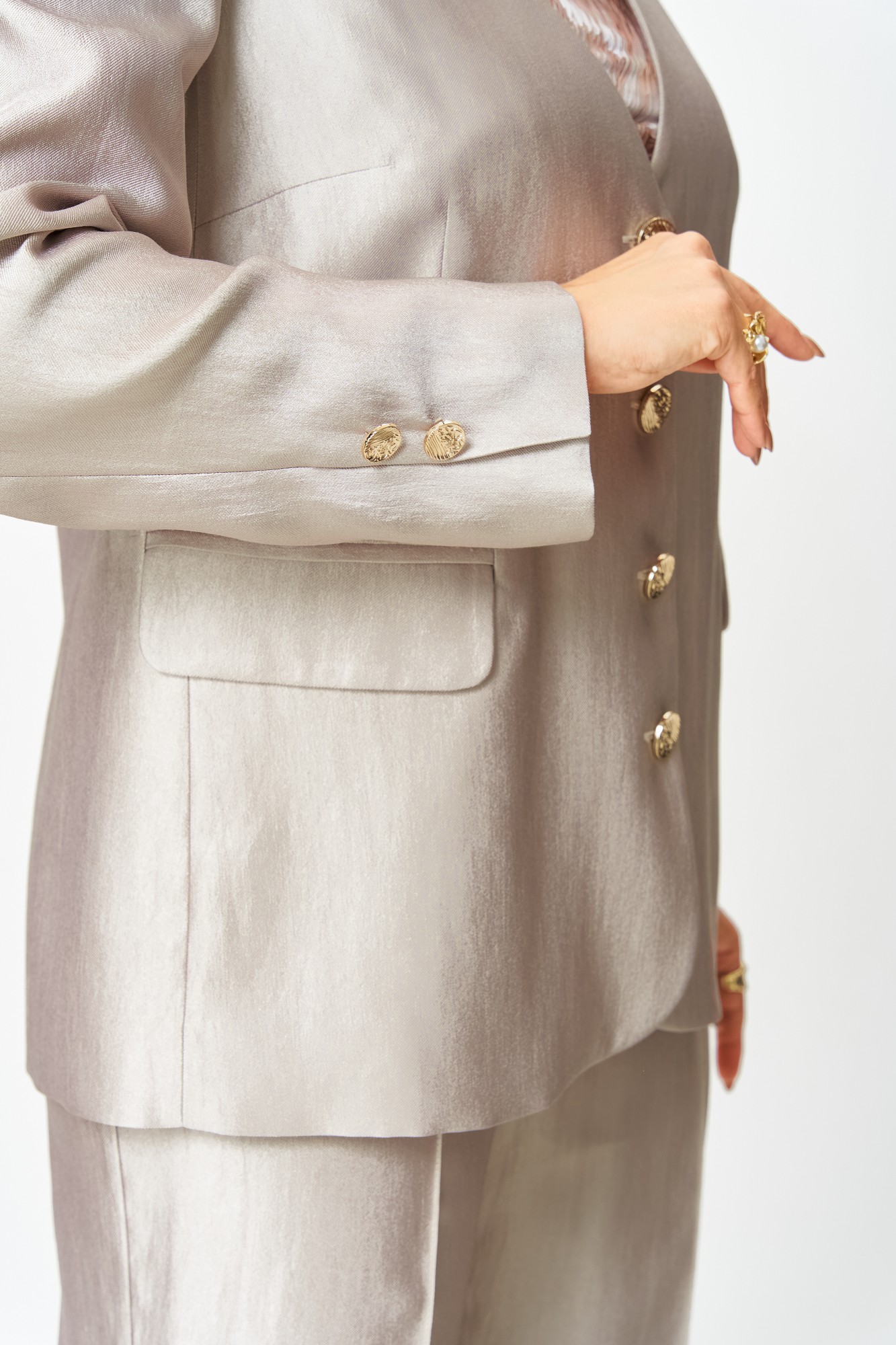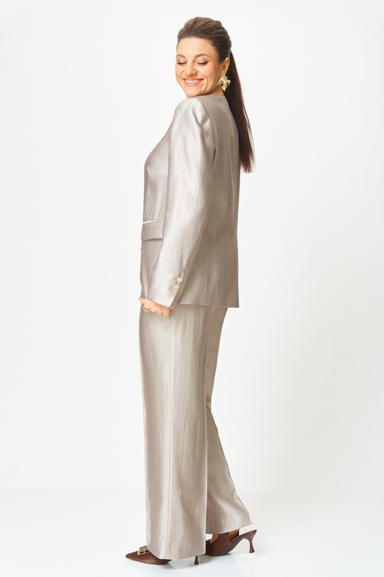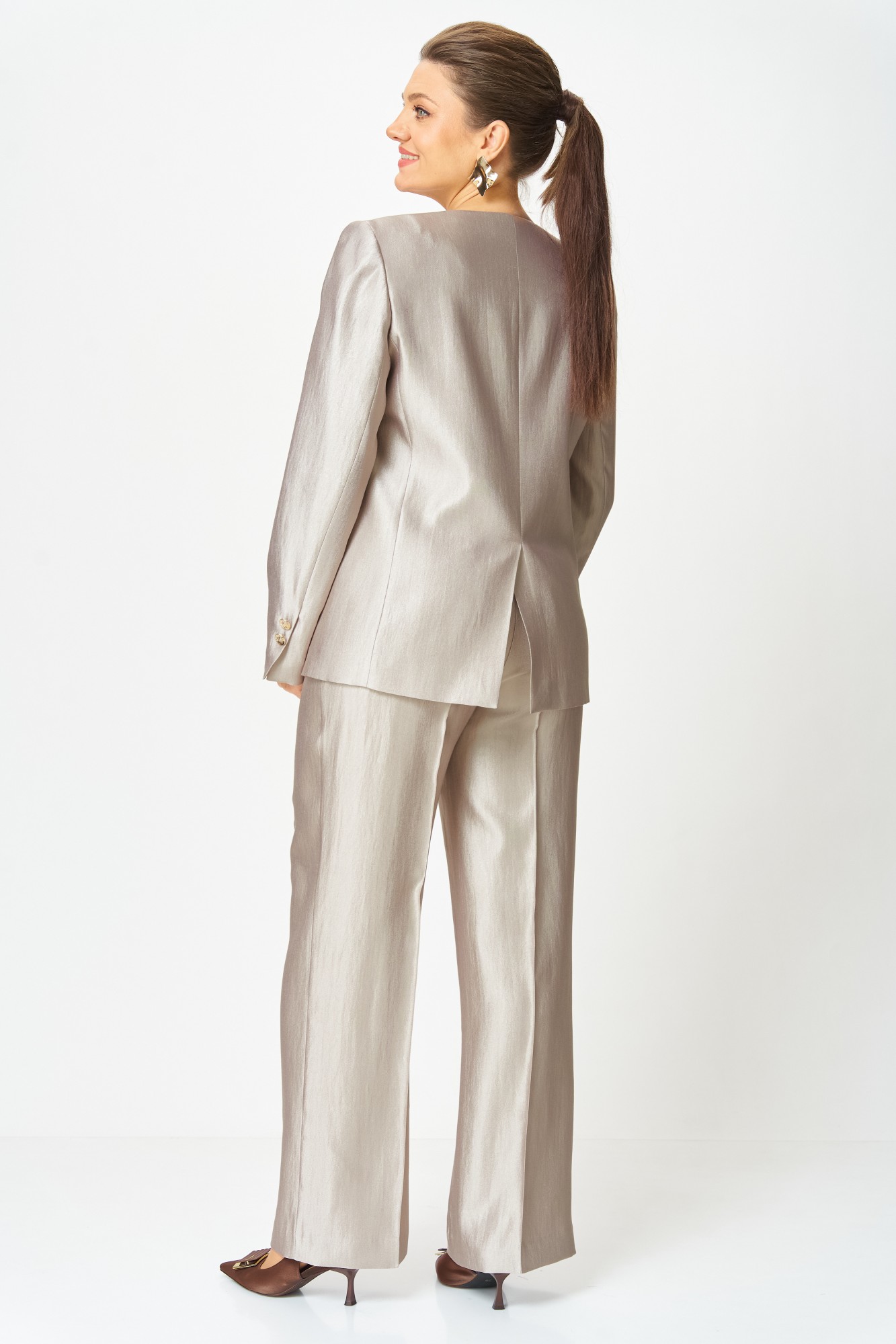 Стильный женский костюм, выполнен в классическом стиле из ткани с небольшим блеском. Костюм состоит из жакета и брюк. Жакет полуприлегающего силуэта, по переду прорезные карманы с клапаном. Горловина «V» образная, застежка центральная на петли-пуговицы. По спинке в центральном шве отлетная шлица по низу. Рукава втачные, по низу отлетная шлица с декором из пуговиц. Жакет на подкладке. Брюки прямые от бедра, с застроченными стрелками по переду и спинке. Застежка по линии банта на молнию и крючок. Верх брюк на обтачке.