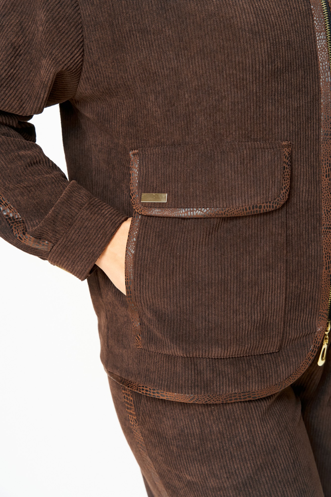 Стильный женский костюм, выполнен из штруксовой ткани, состоит из бомбера и брюк. Бомбер свободного силуэта, с застежкой на декоративную молнию, по переду накладные карманы с клапаном, горловина оформлена стойкой, линия плеча спущена, рукава втачные с лампасом, по низу рукава, манжет с застежкой на декоративную кнопку. Край борта, низ изделия, клапаны и кармана с бейкой из отделочной ткани. Бомбер без подкладки. Брюки свободного силуэта, с лампасом, в боковых швах карманы, верх брюк на поясе с резинкой.