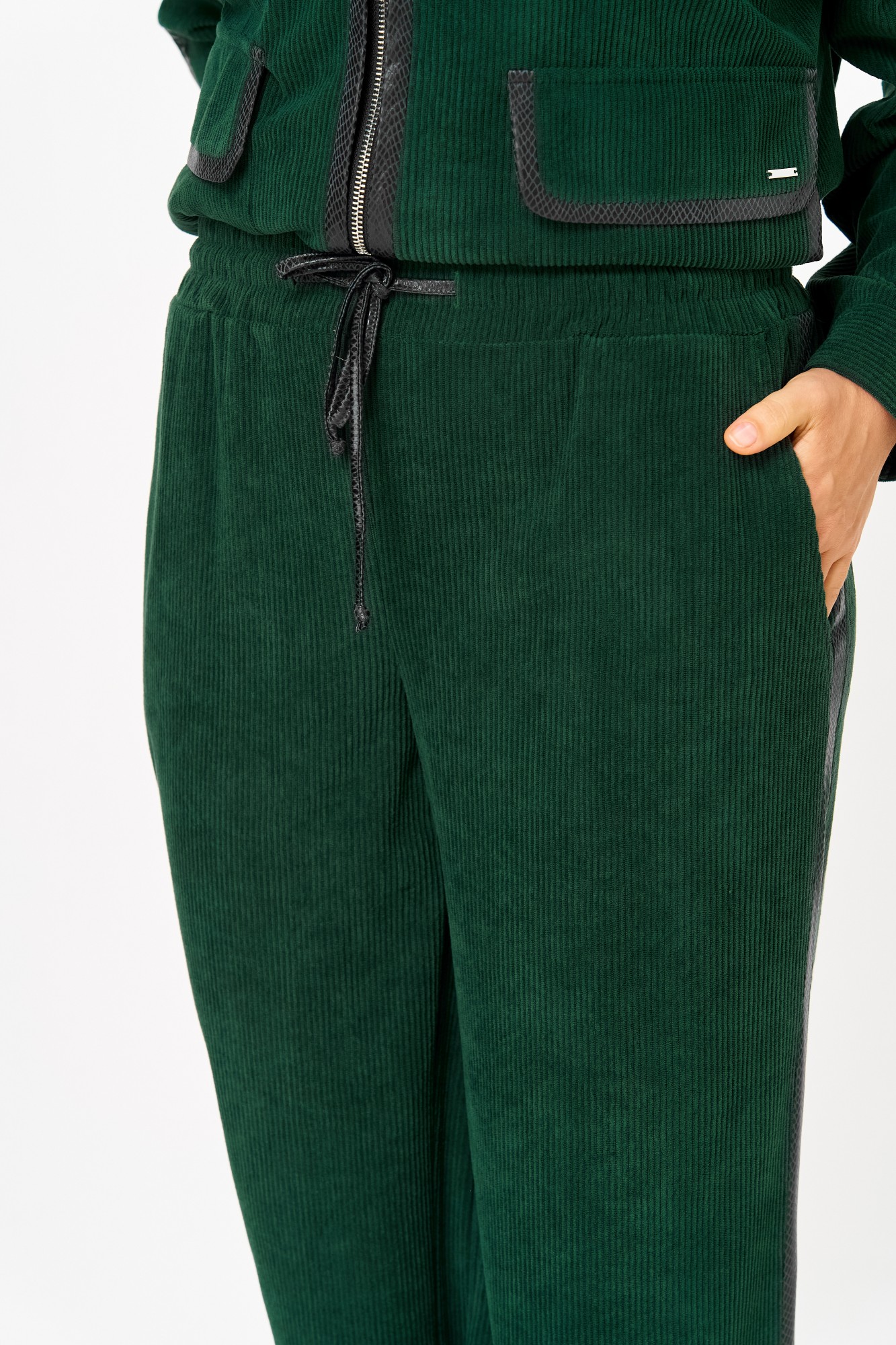 Стильный женский костюм, выполнен из штруксовой ткани, состоит из бомбера и брюк. Бомбер свободного силуэта, с застежкой на декоративную молнию, по переду накладные карманы с клапаном, горловина оформлена стойкой, линия плеча спущена, рукава втачные с лампасом, по низу рукава, манжет с застежкой на декоративную кнопку. Край борта, низ изделия, клапаны и кармана с бейкой из отделочной ткани. Бомбер без подкладки. Брюки свободного силуэта, с лампасом, в боковых швах карманы, верх брюк на поясе с резинкой.