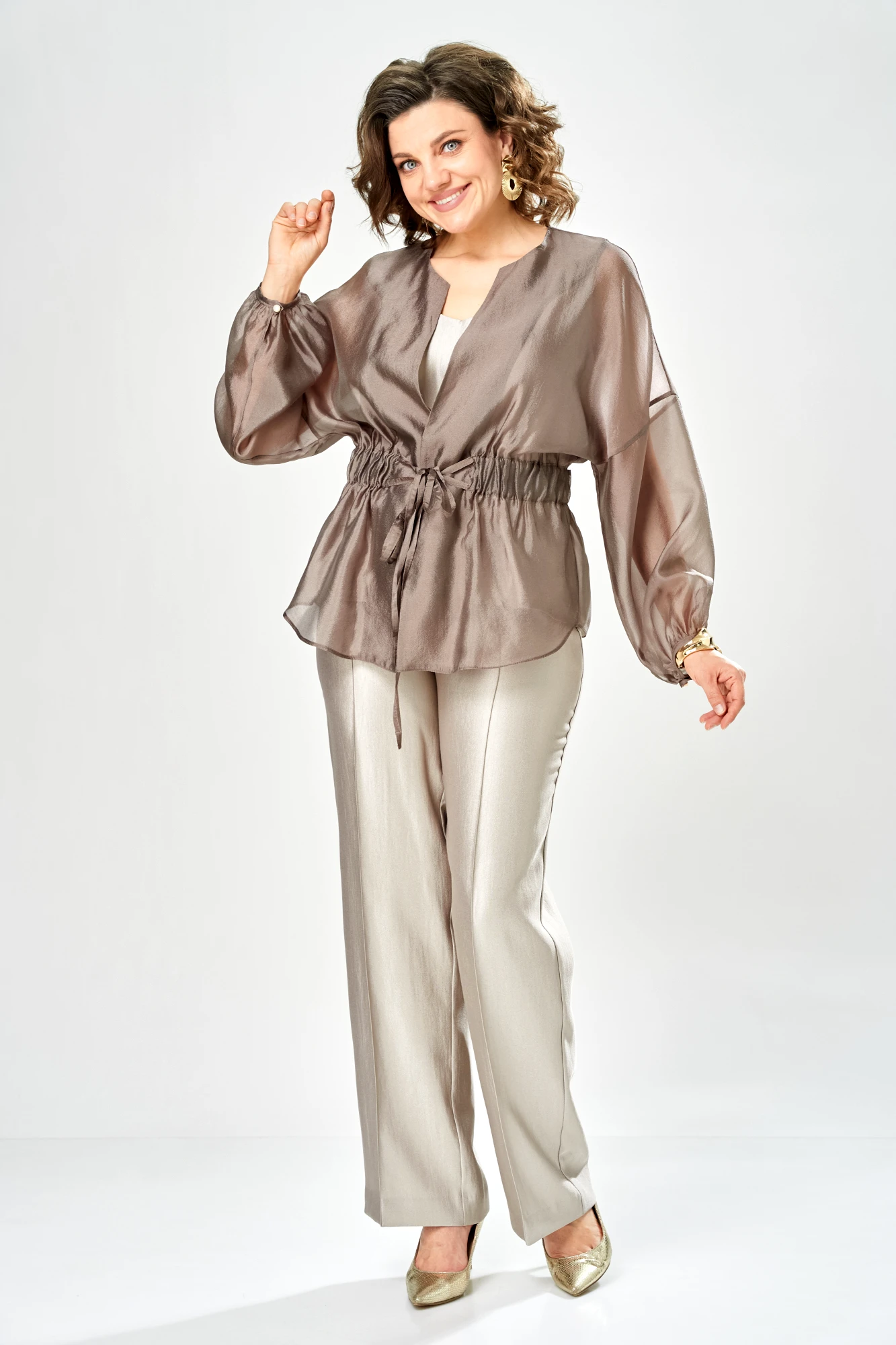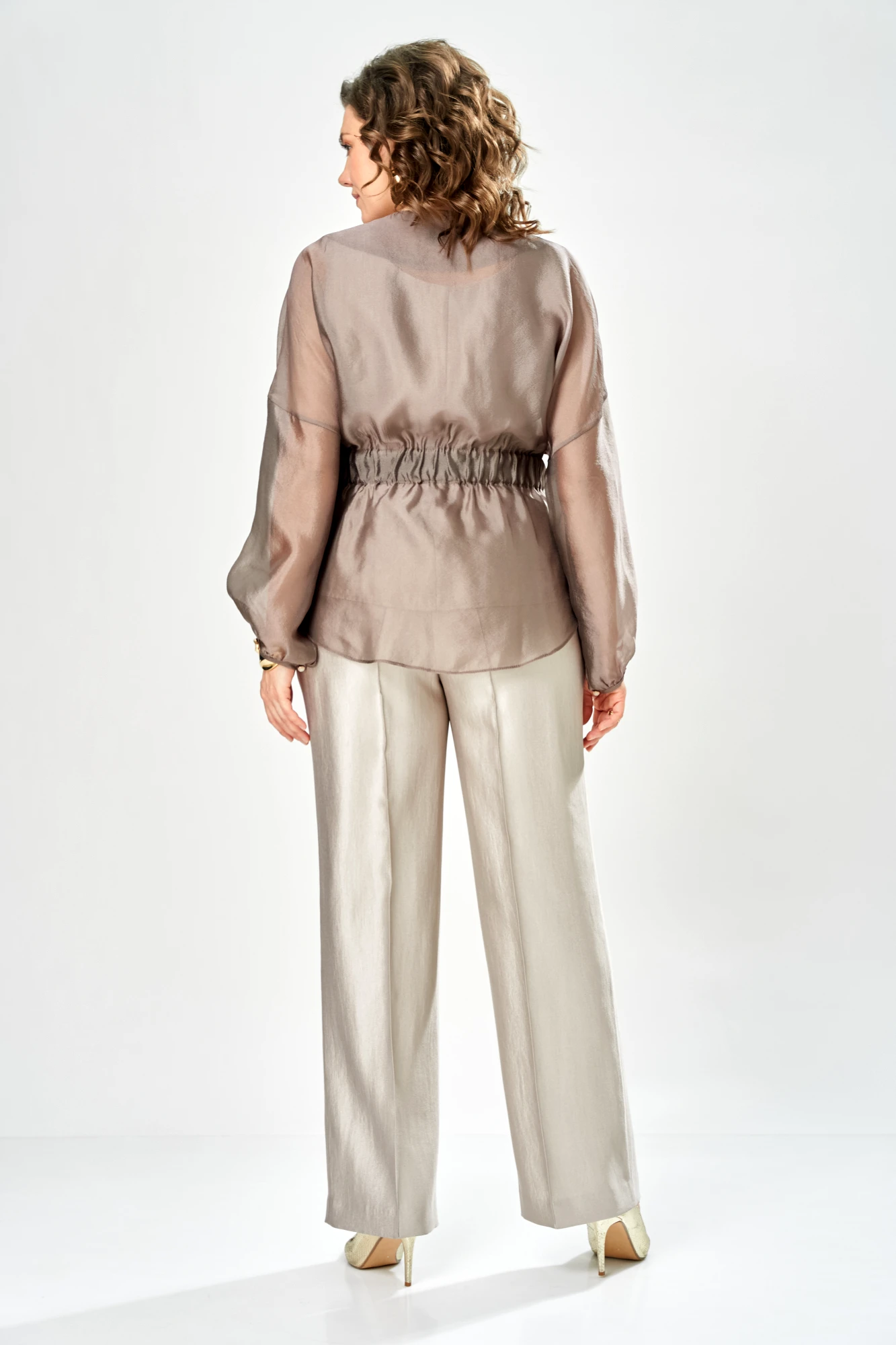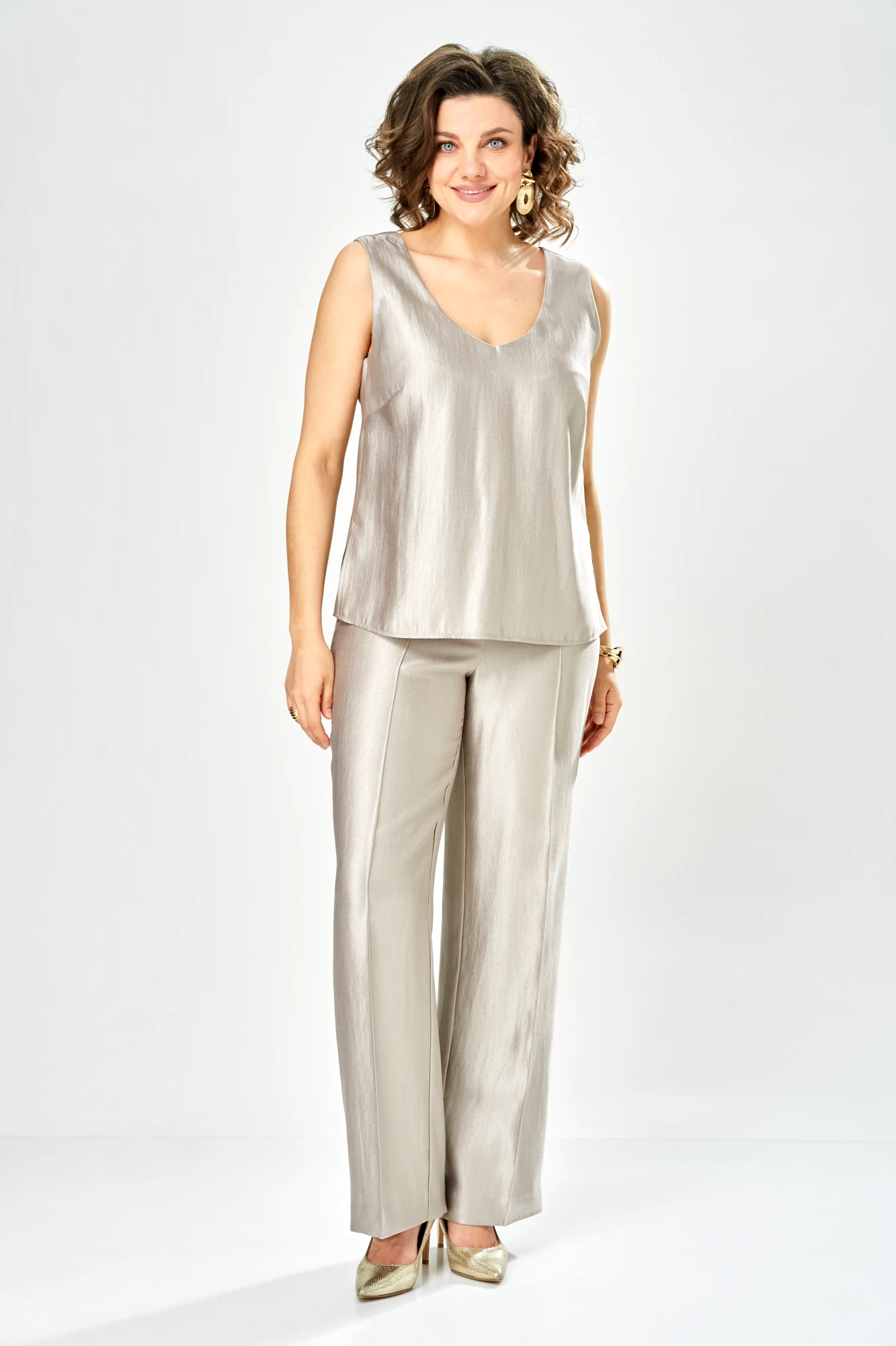 Состав рубашки – полиэстер 100% Состав топа, брюк – вискоза 46%, полиамид 40%, полиэстер 4%