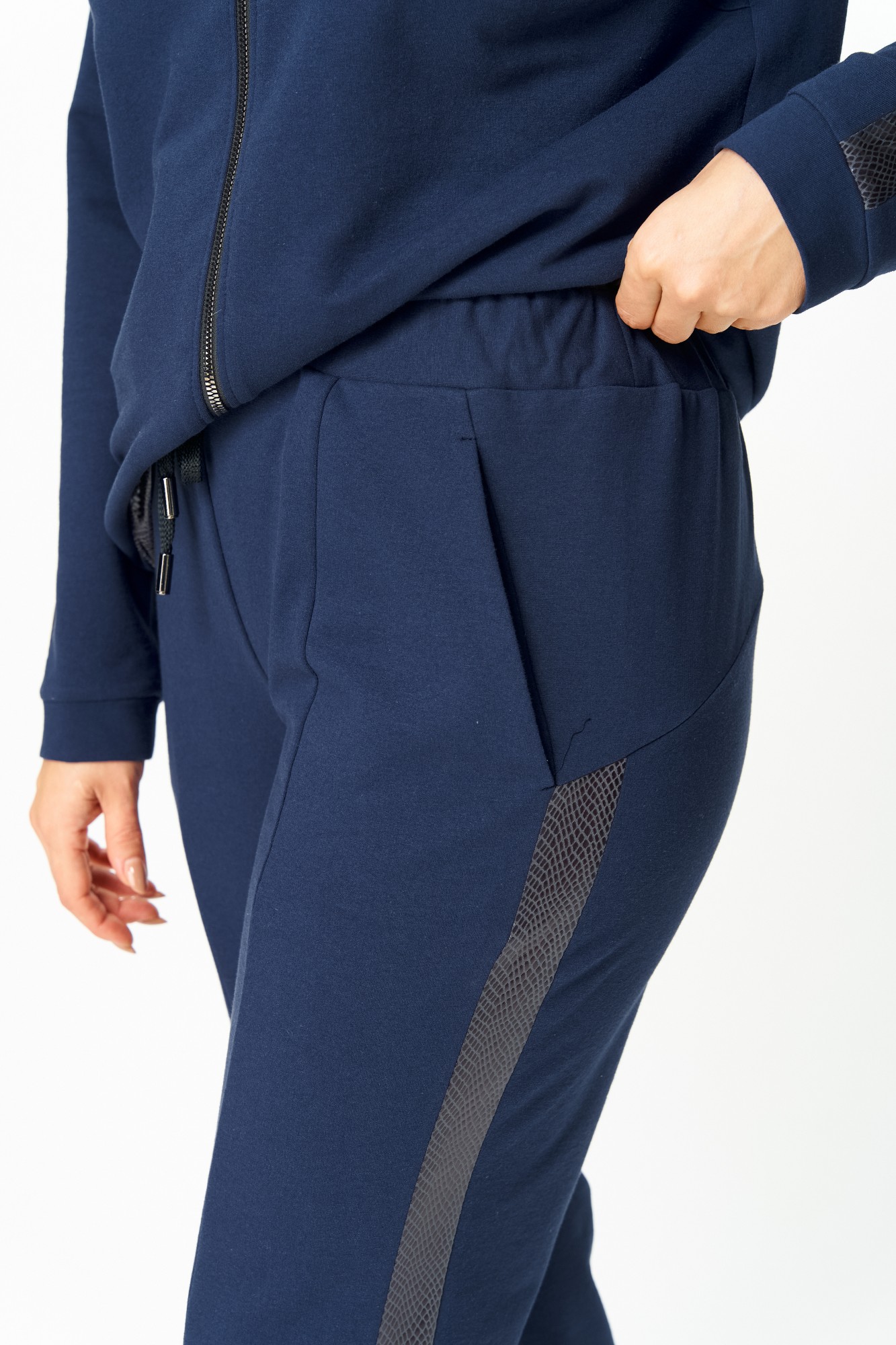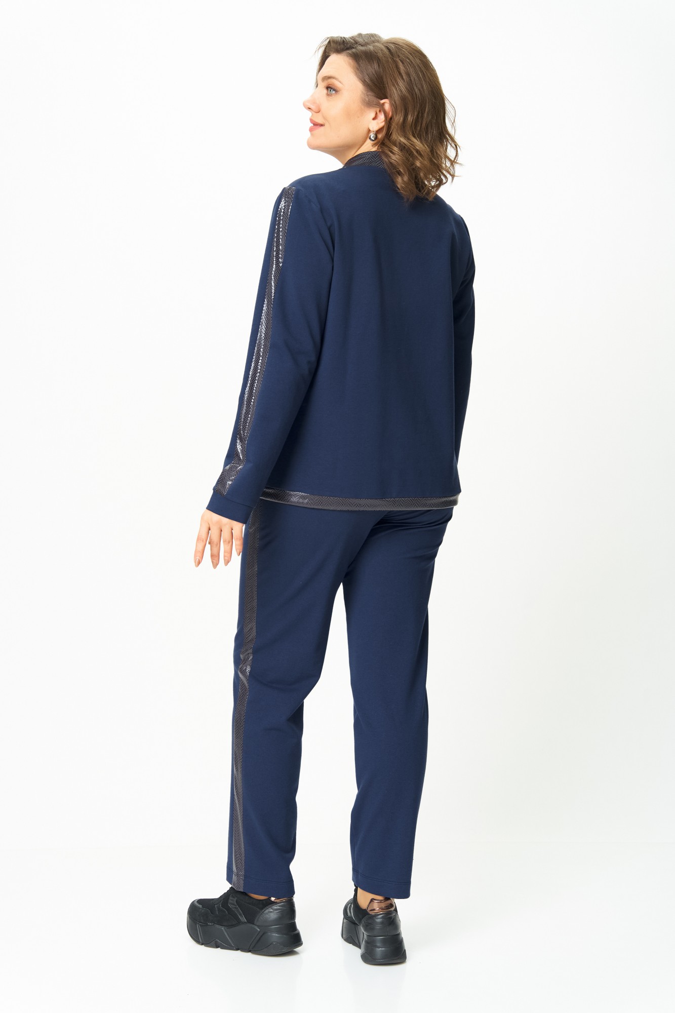 Элементы декора могут меняться. Стильный женский костюм, состоит из блузона и брюк. Костюм выполнен в спортивном стиле. Блузон полуприлегающего силуэта с центральной застежкой на тесьму молнию, с левой стороны на уровне груди фигурный накладной карман с пришивной нашивкой. Горловина оформлена планкой из отделочной ткани. Рукава втачные с отделочным лампасом по центру, низ рукава на манжете из основной ткани. По низу блузона притачная планка с декоративным шнуром. Брюки, зауженные к низу, по верху на задних половинках отрезные кокетки, по боковым швам от кокетки до низа отделочные лампасы, на уровне бедер в швах функциональные карманы. Верх брюк оформлен отрезным поясом с резинкой.