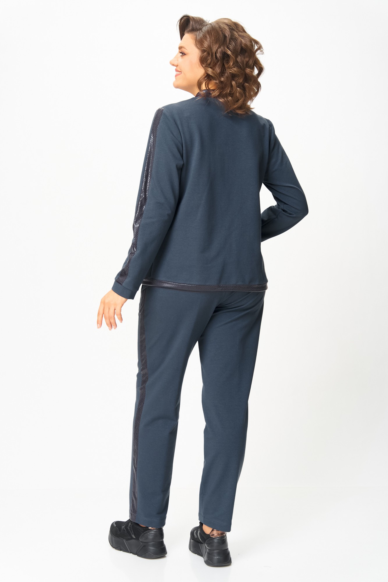 Элементы декора могут меняться. Стильный женский костюм, состоит из блузона и брюк. Костюм выполнен в спортивном стиле. Блузон полуприлегающего силуэта с центральной застежкой на тесьму молнию, с левой стороны на уровне груди фигурный накладной карман с пришивной нашивкой. Горловина оформлена планкой из отделочной ткани. Рукава втачные с отделочным лампасом по центру, низ рукава на манжете из основной ткани. По низу блузона притачная планка с декоративным шнуром. Брюки, зауженные к низу, по верху на задних половинках отрезные кокетки, по боковым швам от кокетки до низа отделочные лампасы, на уровне бедер в швах функциональные карманы. Верх брюк оформлен отрезным поясом с резинкой.