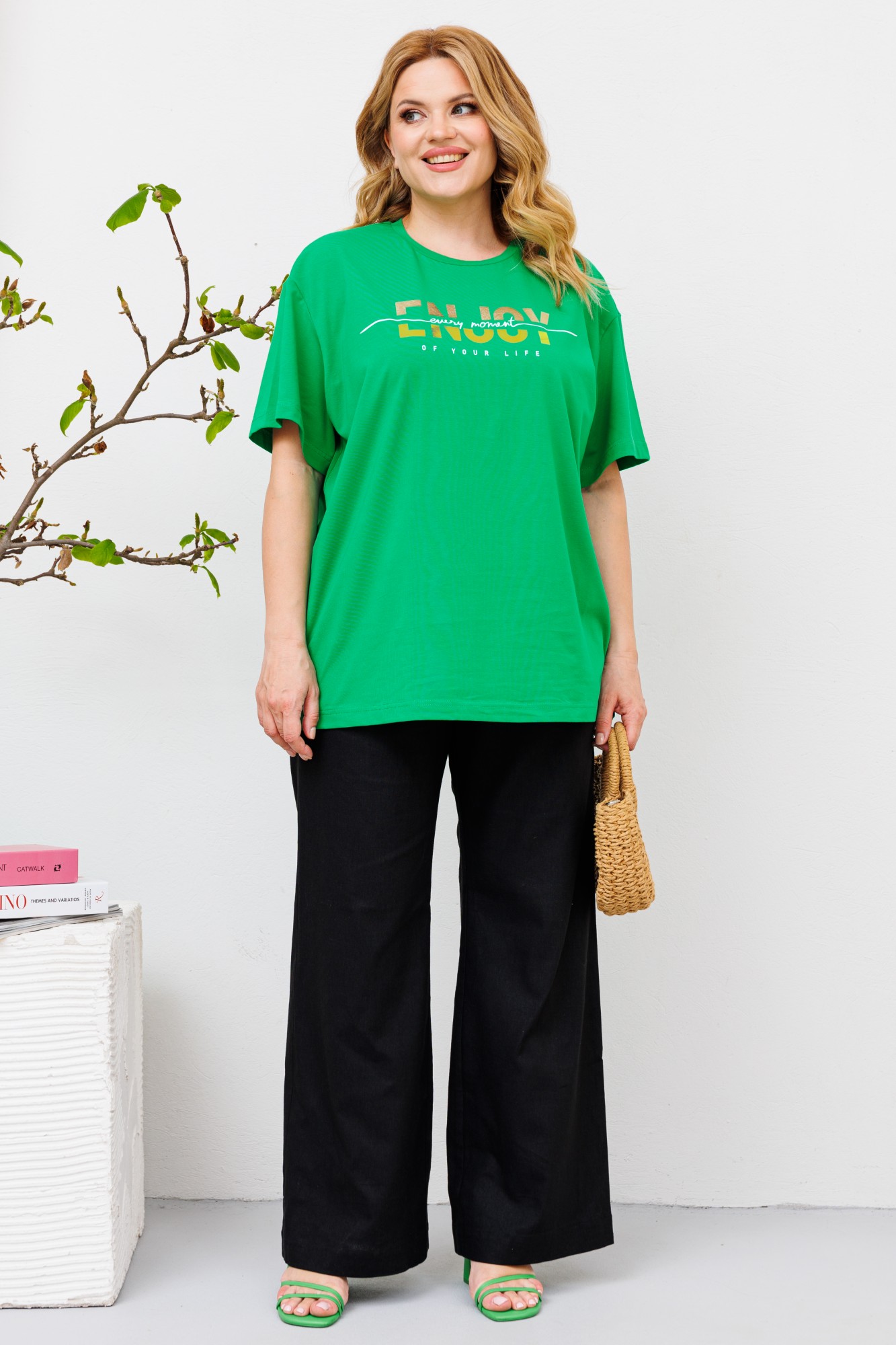Комплект женский состоит из футболки и брюк на резинке. Базовая женская футболка. Крой футболки свободный, оверсайз. Вырез горловины круглый. Рукав до локтя. Линия плеча спущенная. Футболка выполнена из хлопкового трикотажного полотна. Трикотаж не просвечивается, не деформируется после стирки, легко гладится. По переду выполнена авторская печать в виде надписи “enjoy” переливающейся фольгой. Длина - 70 см Льняные брюки свободного кроя. Пояс на резинке, для удобства в носке в пояс вставлен шнурок для регулирования объёма по талии. Посадка брюк - высокая. По переду расположены карманы с наклонным входом. По низу широкая подгибка для возможности коррекции по длине. Брюки с хорошей посадкой, в этом заключается их секрет универсальности и возможности носить их девушкам с любым типом фигуры. Идеальные брюки для летней жары, в них ваша кожа будет дышать. Они выполнены из мягкого льна с вискозой. Отличный вариант, как для городского лета, так и отдыха на море. Лен хорошо поглощает влагу, не вызывает аллергии, обладает высокой степенью воздухопроницаемости. Ткань не просвечивается, и не катается после носки.