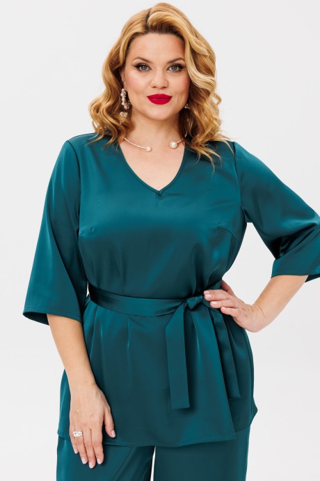 Комплект, состоящий из блузки и брюк, из струящейся ткани. Блузка полуприлегающего силуэта , с V- образным вырезом горловины. Рукава втачные ,длина 3/4, Для прилегания талии , в комплект входит пояс из основной ткани. Брюки лаконичные, прямого силуэта, пояс на резинке. Идеальный вариант для торжественных мероприятий, встреч с друзьями.