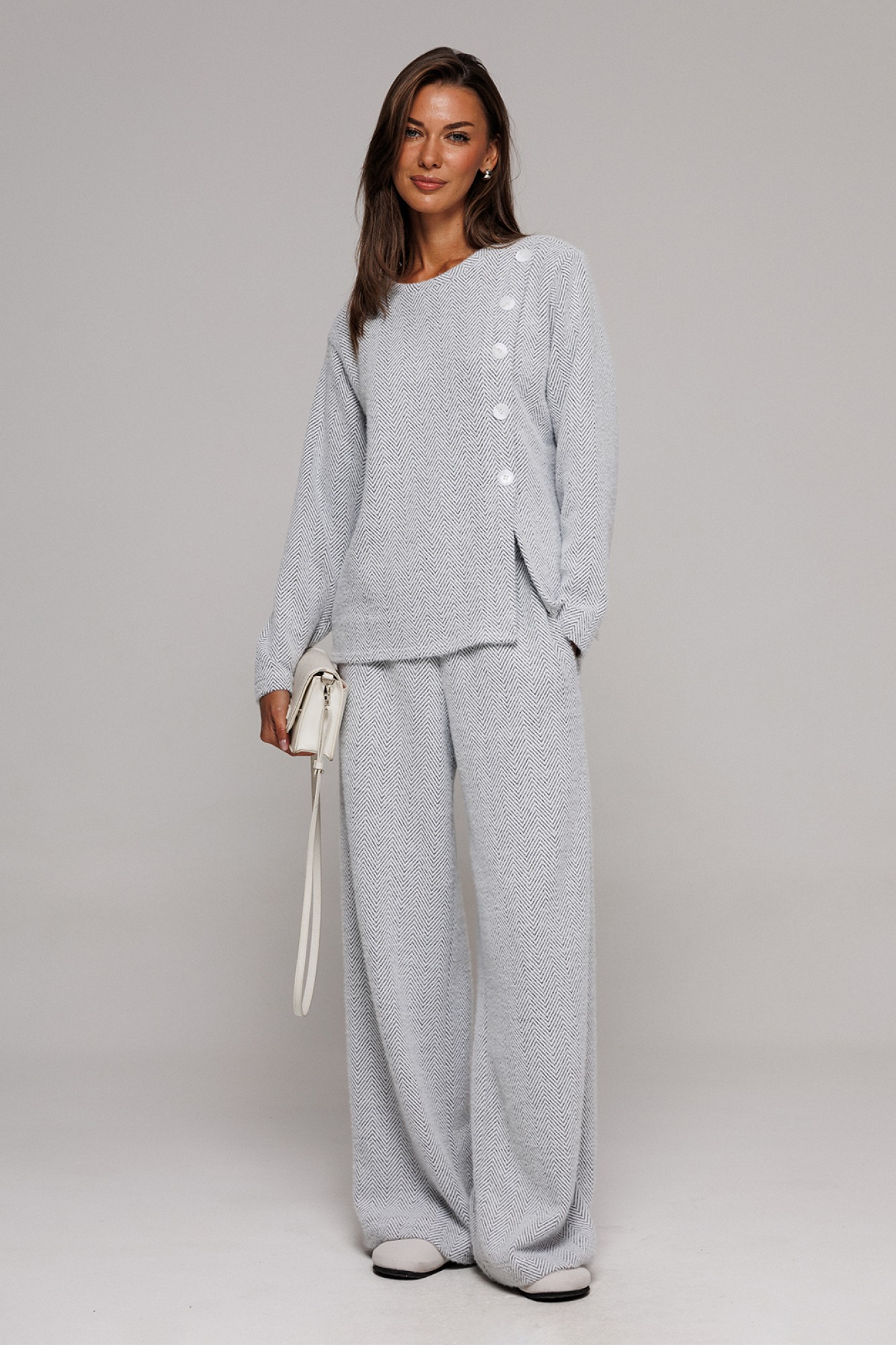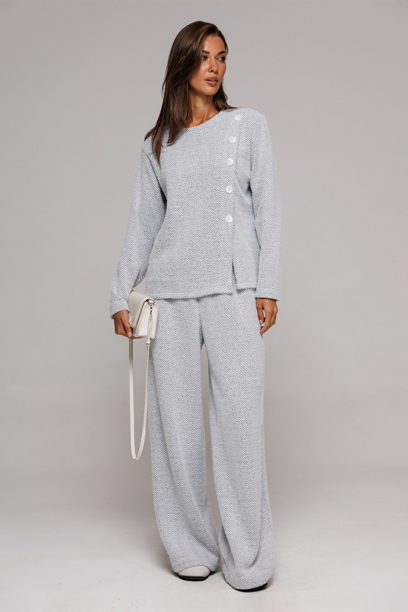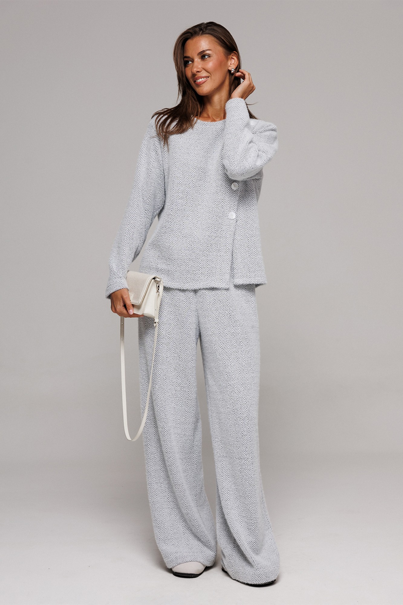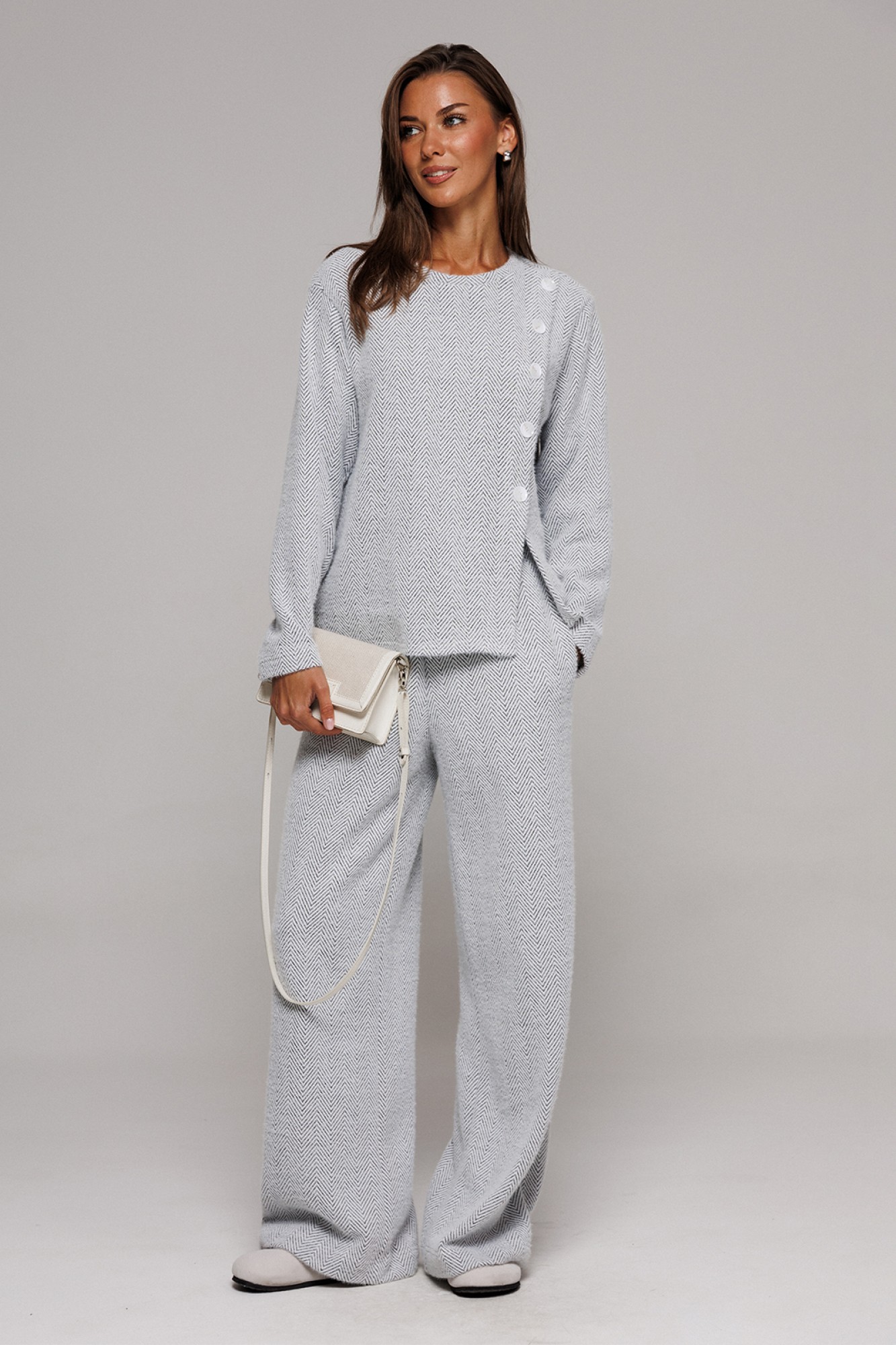 Костюм состоит и 2-ух предметов: джемпера и брюк. Джемпер из трикотажного полотна прямого силуэта со спущенной линией плеча. Рукав втачной. По переду имитация диагональной застежки на петли-пуговицы. По горловине планка из основной ткани. Брюки на цельнокроеном отстроченном поясе со вставленной в него резинкой. Брюки прямого силуэта с карманами в боковых швах.