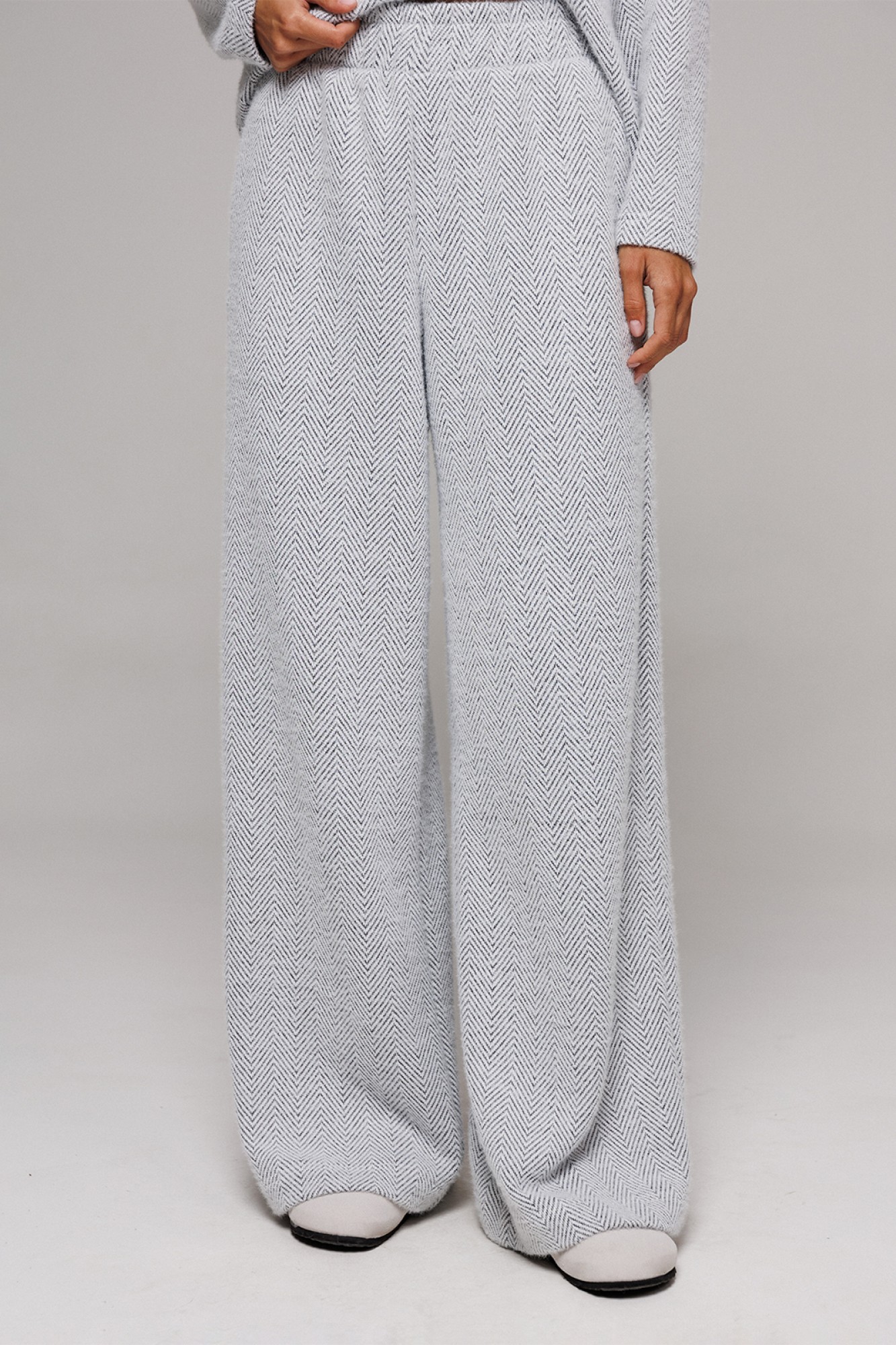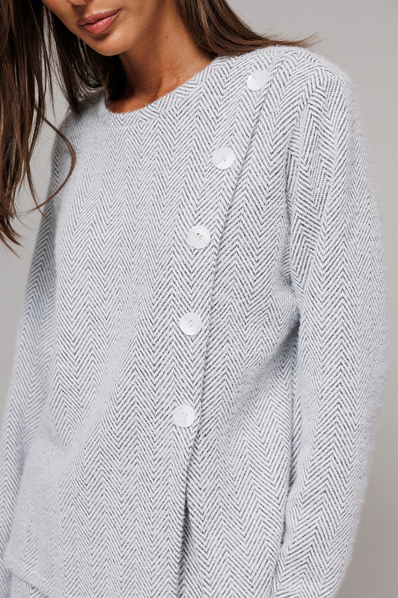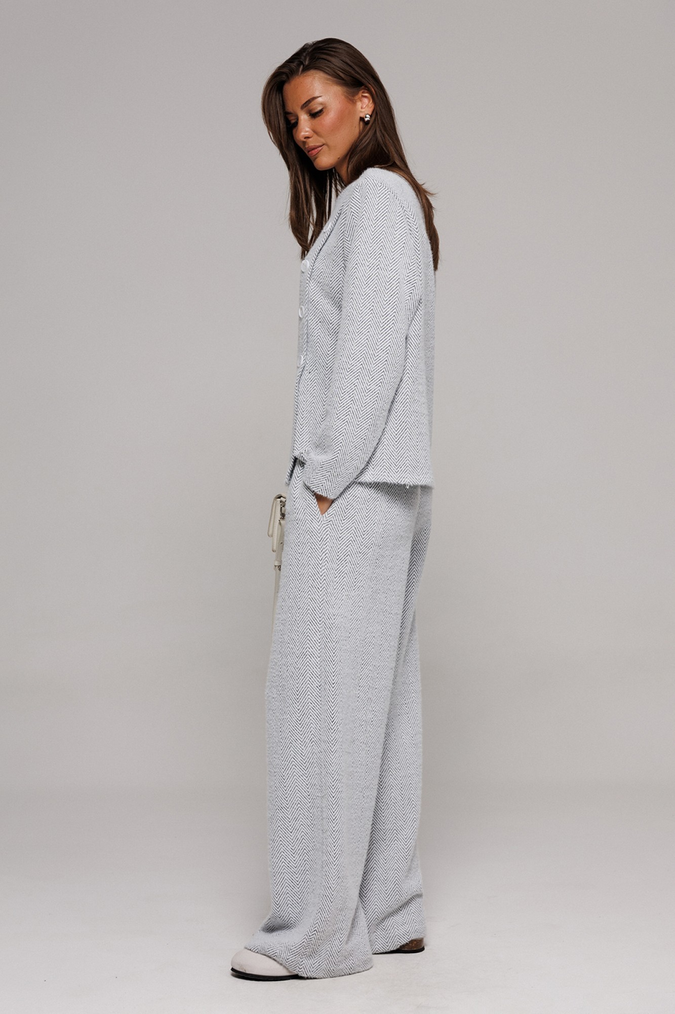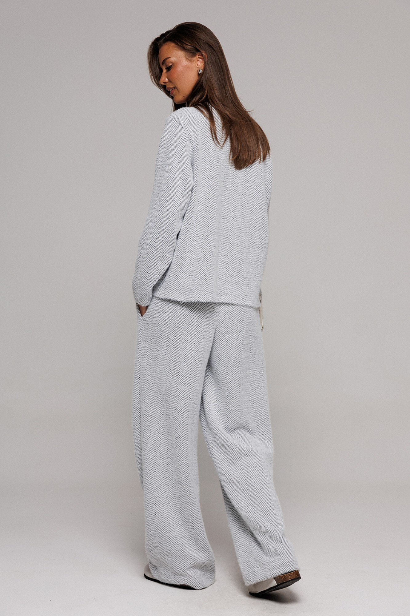 Костюм состоит и 2-ух предметов: джемпера и брюк. Джемпер из трикотажного полотна прямого силуэта со спущенной линией плеча. Рукав втачной. По переду имитация диагональной застежки на петли-пуговицы. По горловине планка из основной ткани. Брюки на цельнокроеном отстроченном поясе со вставленной в него резинкой. Брюки прямого силуэта с карманами в боковых швах.