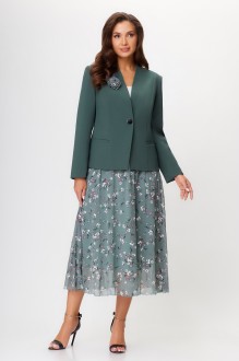 Костюм женский 2-х предметный, состоящий из блузы и юбки-брюк. Блузка полуприлегающего силуэта с заниженной линией плеча без воротника. По переду ассиметричный рельеф с планкой из отделочной ткани. По центру переда расположен декоративный цветок из отделочной ткани, украшенный стразами. В боковых швах обработаны разрезы. По спинке-центральный шов с разрезами в верху и застёжкой на петлю и пуговицу. Рукав прямой, длинной ¾ с бейкой по низу из отделочной ткани. Брюки широкие, прямого силуэта, без карманов, пояс на резинке. По верх брюк из шифона в пояс в точена юбка с запахом спереди и разрезами сзади и по бокам.