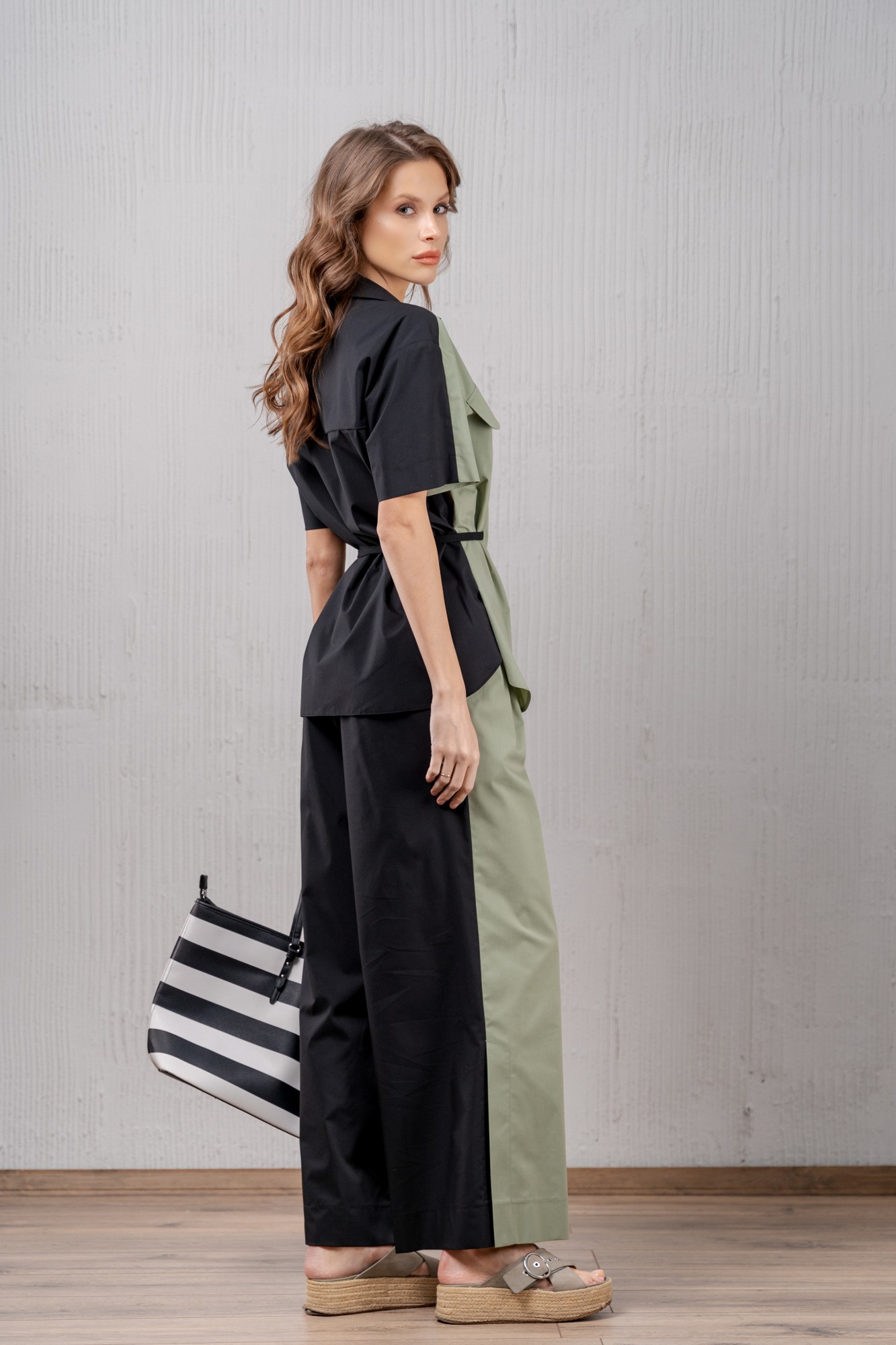 Комплект женский двухпредметный из контрастного хлопка. Рубашка из хлопка свободного силуэта со спущенной линией плеча. Вырез горловины с рубашечным контрастным воротником. Застёжка по переду на петли и пуговицы. Рукава втачные на базе цельнокроеных с верхним швом, задняя часть контрастная. Перед с отделочными асимметричными клапанами. Рубашка укомплектована шнуром-поясом, который продевается в петли по переду. Длина спинки - 90 см. Длина рукава от линии горловины - 39 см. Отделочная фурнитура может меняться. Брюки расширенные от бедра со складками от талии. В боковых швах карманы с отрезными бочками. Задние половинки брюк из контрастной ткани. Пояс- отрезной с эластичной тесьмой. Длина с учетом пояса - 104 см.
