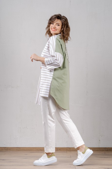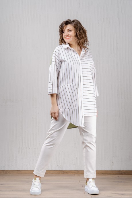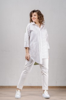 Комплект женский двухпредметный. Рубашка свободного силуэта из хлопковой ткани в полоску по переду и из однотонной по спинке. Воротник рубашечного типа. Застежка потайная на петли и пуговицы. Рукава на базе цельнокроеных, по низу паты. Левая часть переда с полоской поперёк и короче правой. На правой части переда накладной карман. На спинке кокетка, хлястик от горловины и складки от кокетки по бокам. В боковых швах разрезы. Низ асимметричный, фигурный. Длина по спинке - 88 см. Длина рукава от горловины - 61 см. Брюки прилегающего силуэта. Пояс отрезной со вставкой эластичной тесьмы, застежка на молнию и петлю с пуговицей. В боковых швах карманы с отрезным бочком. Длина с учетом пояса - 99 см.