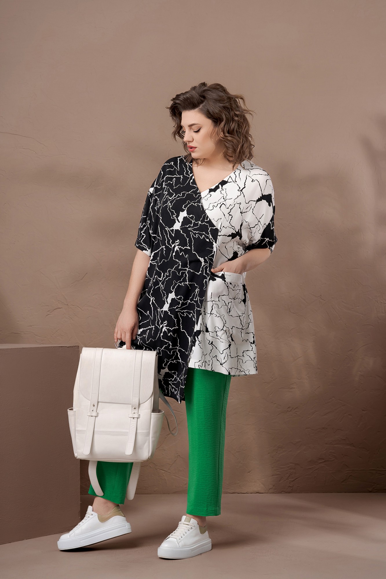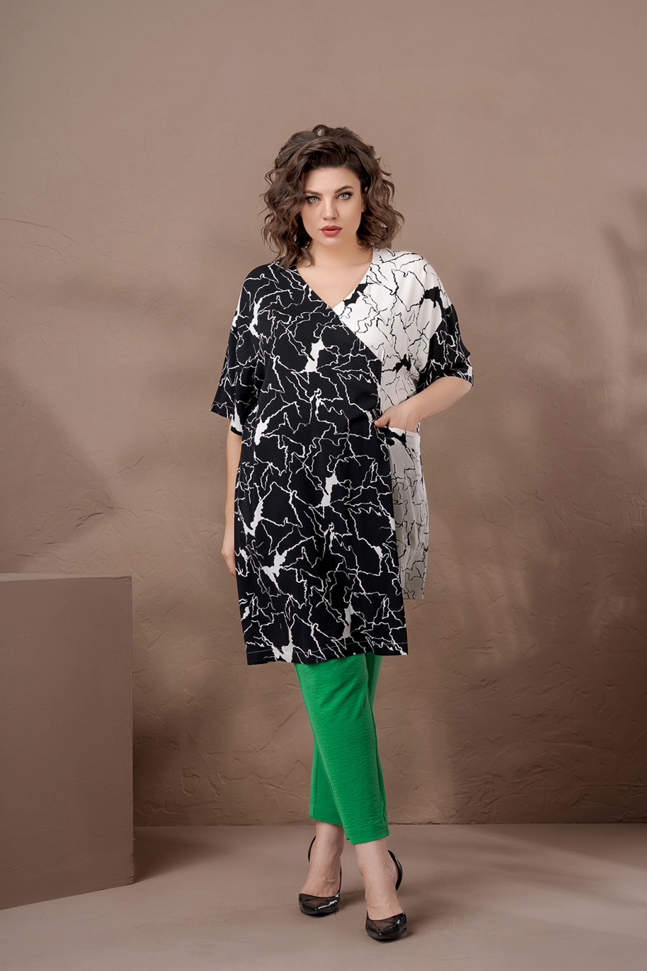 Комплект женский двухпредметный. Туника свободного покроя из легкой вискозной ткани двух цветов. Вырез горловины V-образный с имитацией запаха. Рукава- отрезные на базе спущенного. По переду слева накладной карман. Низ асимметричный с шлицами по переду и спинке. Брюки свободного покроя, зауженные к низу. В боковых швах - карманы с отрезными бочками. Пояс- отрезной с эластичной тесьмой.