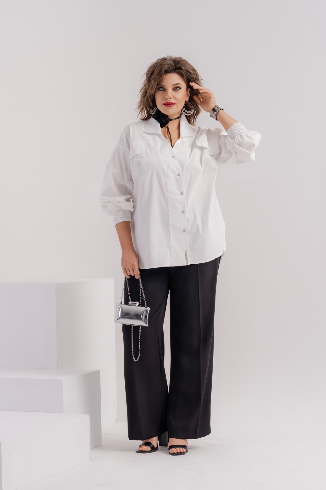 Комплект женский двухпредметный. Блуза из хлопковой ткани свободного силуэта. Воротник отложной, рукава отрезные на базе цельнокроеного, по низу широкий манжет собраный на венгерку. Застежка надекоративные кнопки. В боковых швах разрезы. На спинке кокетка, складка. Брюки - свободного покроя, прямые от бедра. Пояс - отрезной с эластичной тесьмой, карманы с отрезным бочком.
