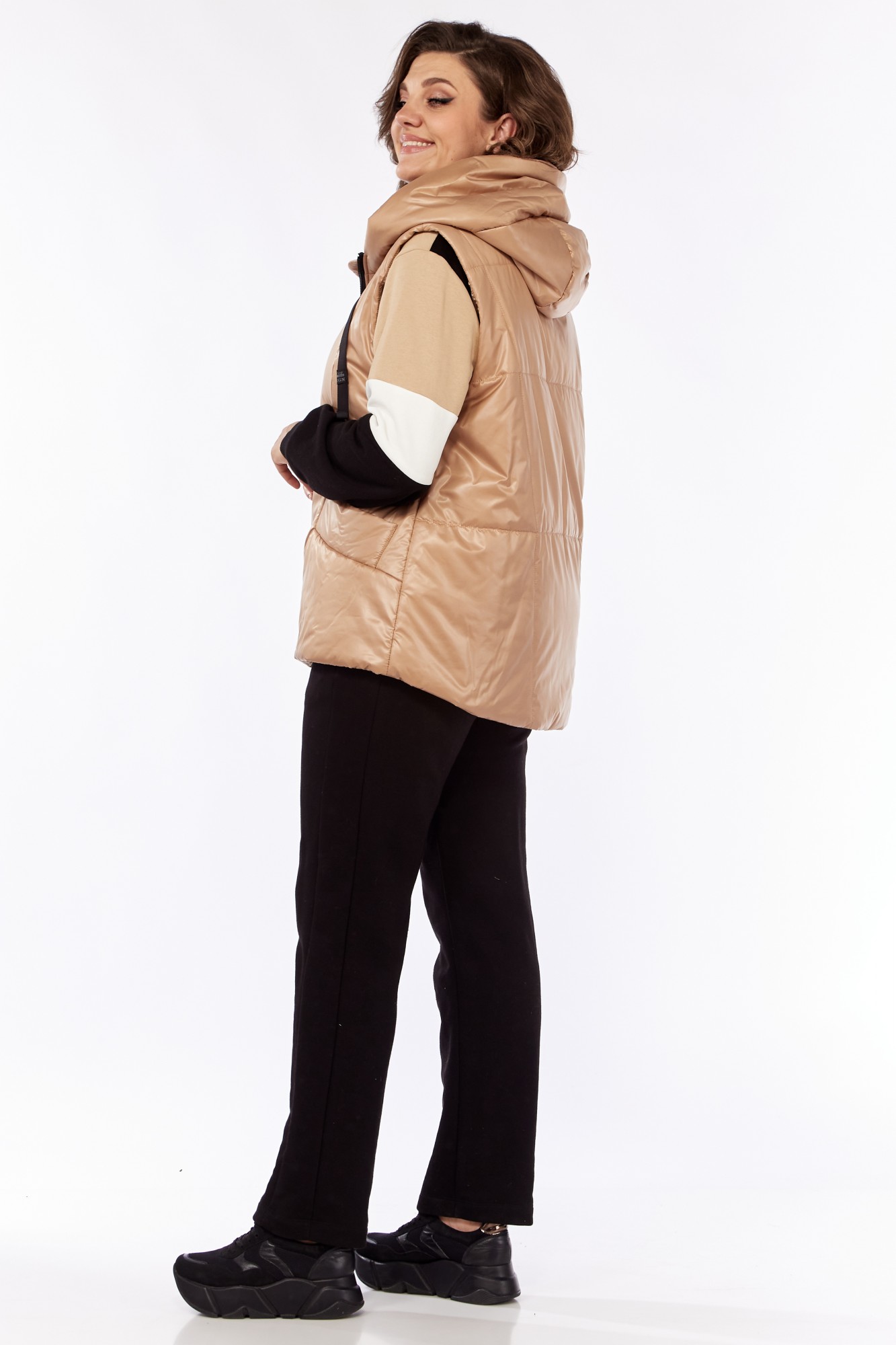 Комплект брючный(жилетка+кофта+брюки)Брюки зауженные к низу с поясом на резинке и ламапасами по бокам в цвет брюк. Джемпер 3-х цветный. Спинка из основной ткани , а перед с двумя подрезами по горизонтали. Жилет из плащёвой ткани с застёжкой "молния". Перед с отрезными бочками и карманами с листочкой. Спинка со стёжкой. Капюшон с кулисой и шнуром.