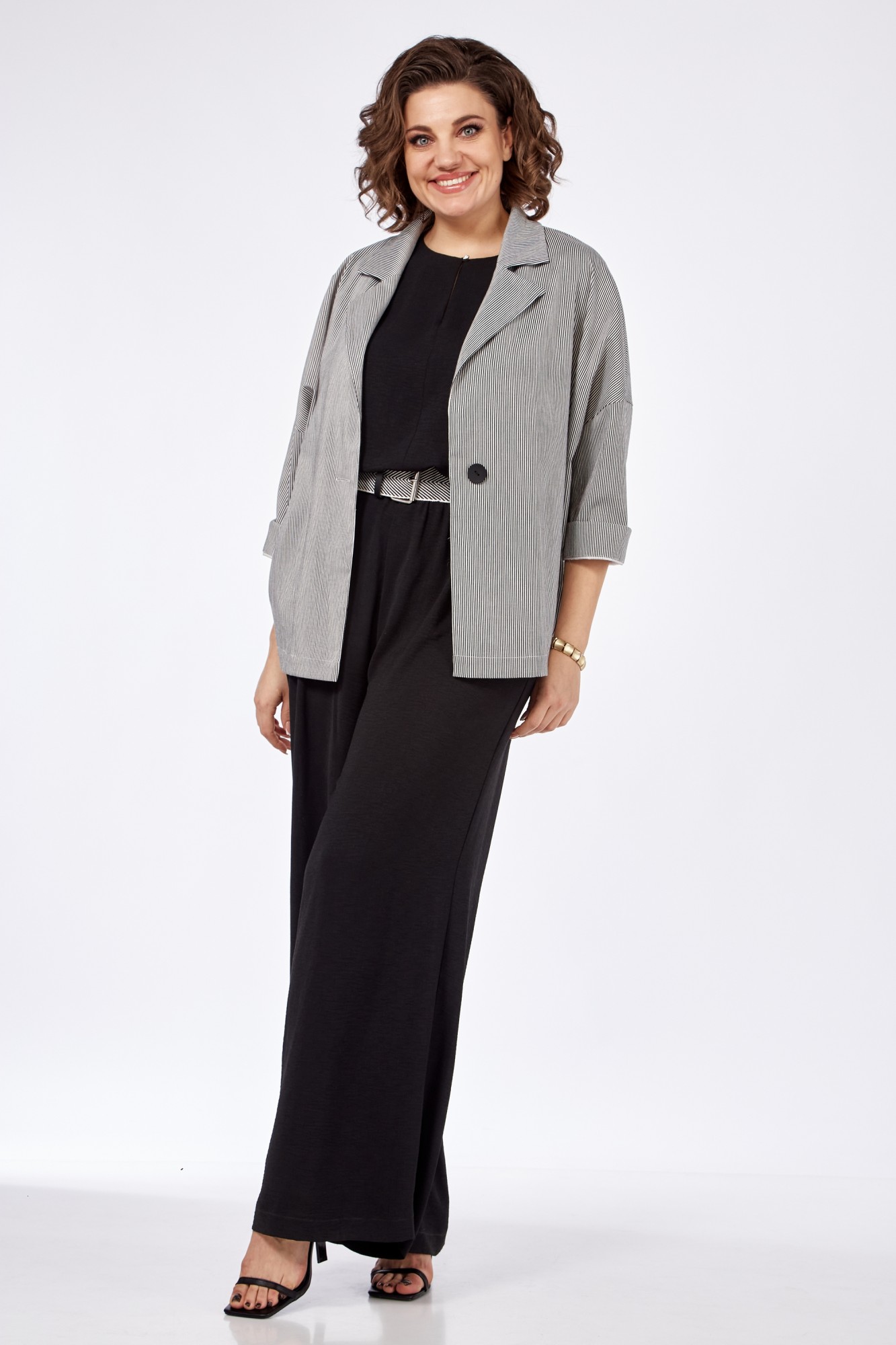 Комплект женский состоит из комбинезона и жакета. Комбинезон свободного кроя с застежкой на поясную петлю и пуговицу и на спинке, и спереди. Верхняя часть с нагрудными вытачками. Нижняя часть с боковыми карманами в швах. В области талии резинка. Жакет свободного кроя с застежкой на петлю и пуговицу. Рукав одношовный со спущенной линией плеча. Воротник пиджачного типа. Пояс в комплекте.