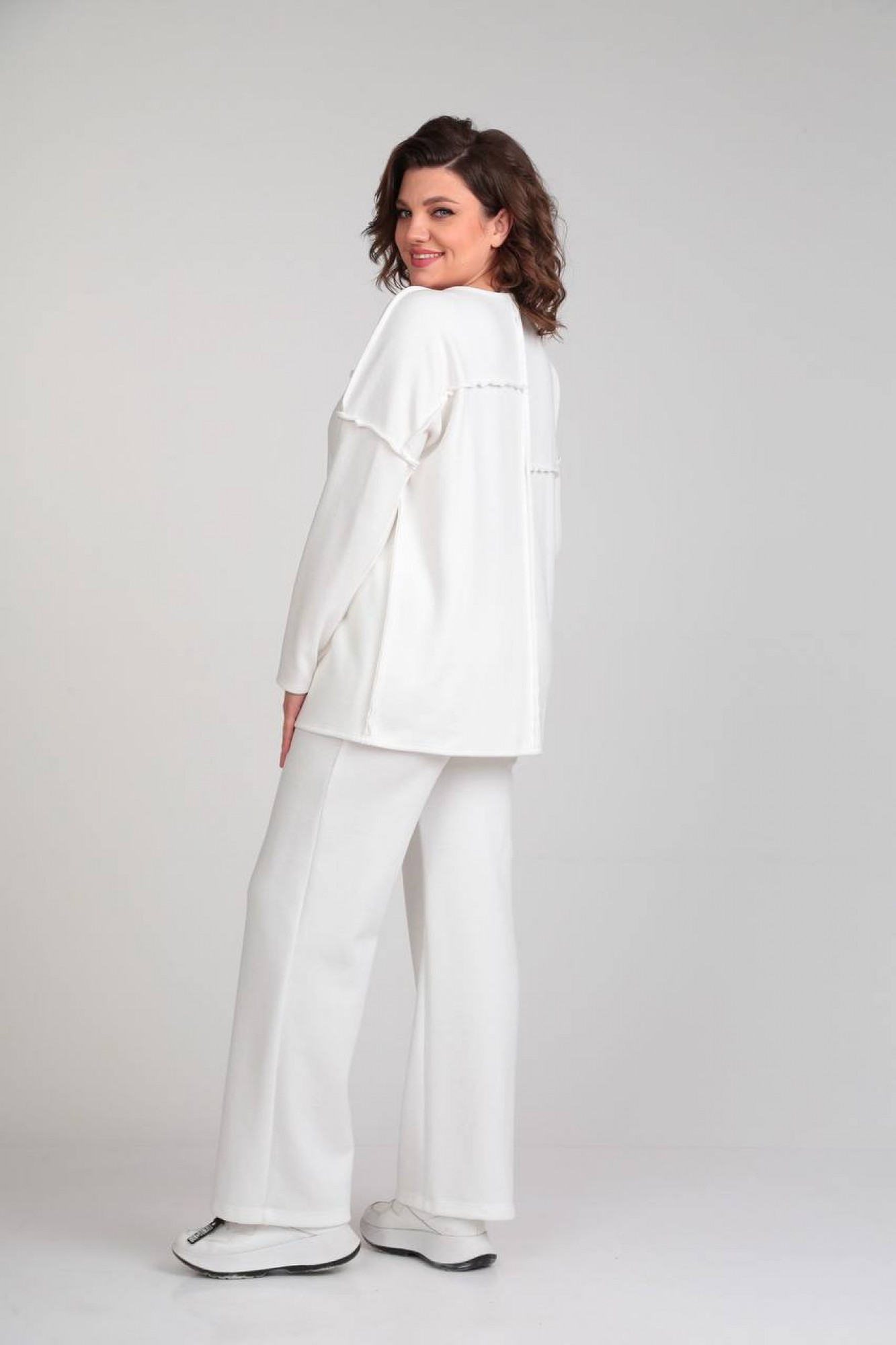 Комплект брючный : джемпер и брюки из трикотажного полотна. Джемпер с разрезными на 4 части передом и спинкой, швы обработаны припусками на лицо. Горловина округлой формы обработана распошивочным швом. Низ рукава и изделия тоже обработаны распошивочным швом. Брюки прямые. Цельнокроеный пояс на резинке.