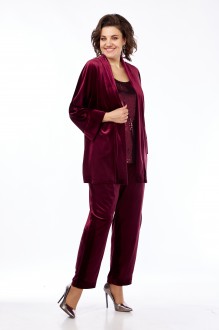 Комплект брючный состоит из жакета, майки и брюк. Жакет-кимоно свободного кроя без застежки. Рукав цельнокройный с притачным манжетом. Пояс съемный. Майка из отделочной ткани. Перед с пайетками, спинка из тонкого трикотина. Горловина округлой формы. Брюки свободного кроя, чуть заужены к низу. Передние половинки брюк с талиевыми вытачками . Задние половинки со складками и отстрочкой по гульфику. Пояс притачной на резинке.