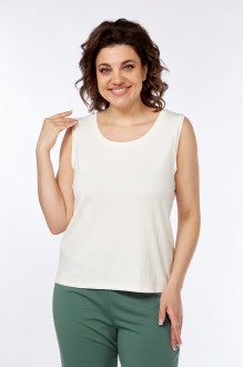 Комплект брючный (жакет+майка+брюки). Жакет полуприлегающего силуэта с центральной застежкой на петли и пуговицы. По спинке средний шов со шлицей. По переду вытачки, накладные карманы. Воротник стояче-отложной с открытыми бортами . Рукав втачной 2-шовный с лампасом переходящим на плечевой. Жакет без подкладки. Майка полуприлегающего силуэта. Горловина и пройма обработаны бейками. Брюки прямые. верхний срез обработан поясом с резинкой со шнурком. По боковому шву лампас. Используется три ткани. В качестве отделки используется печать.