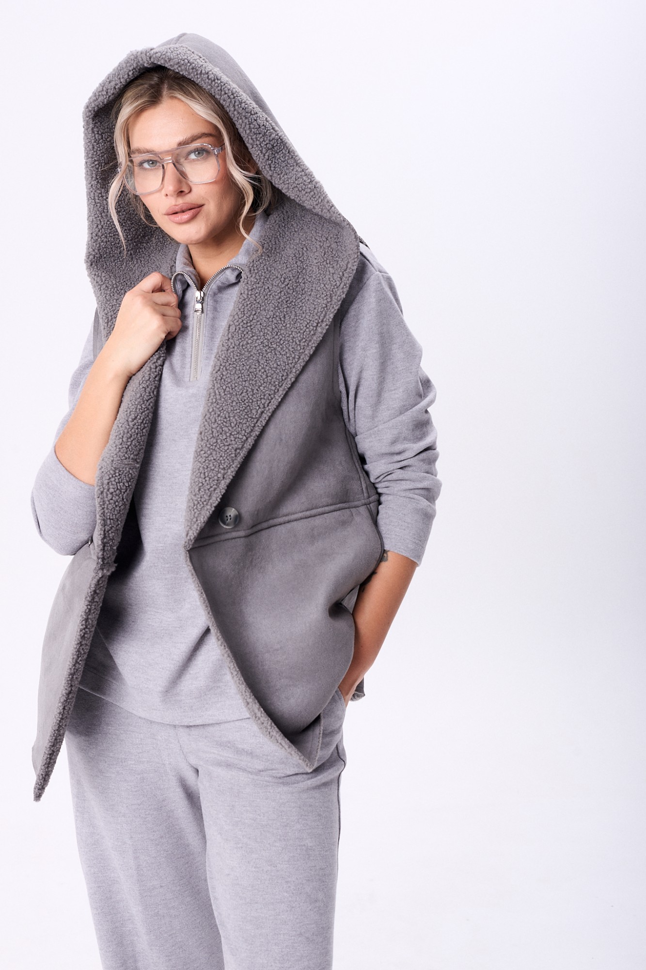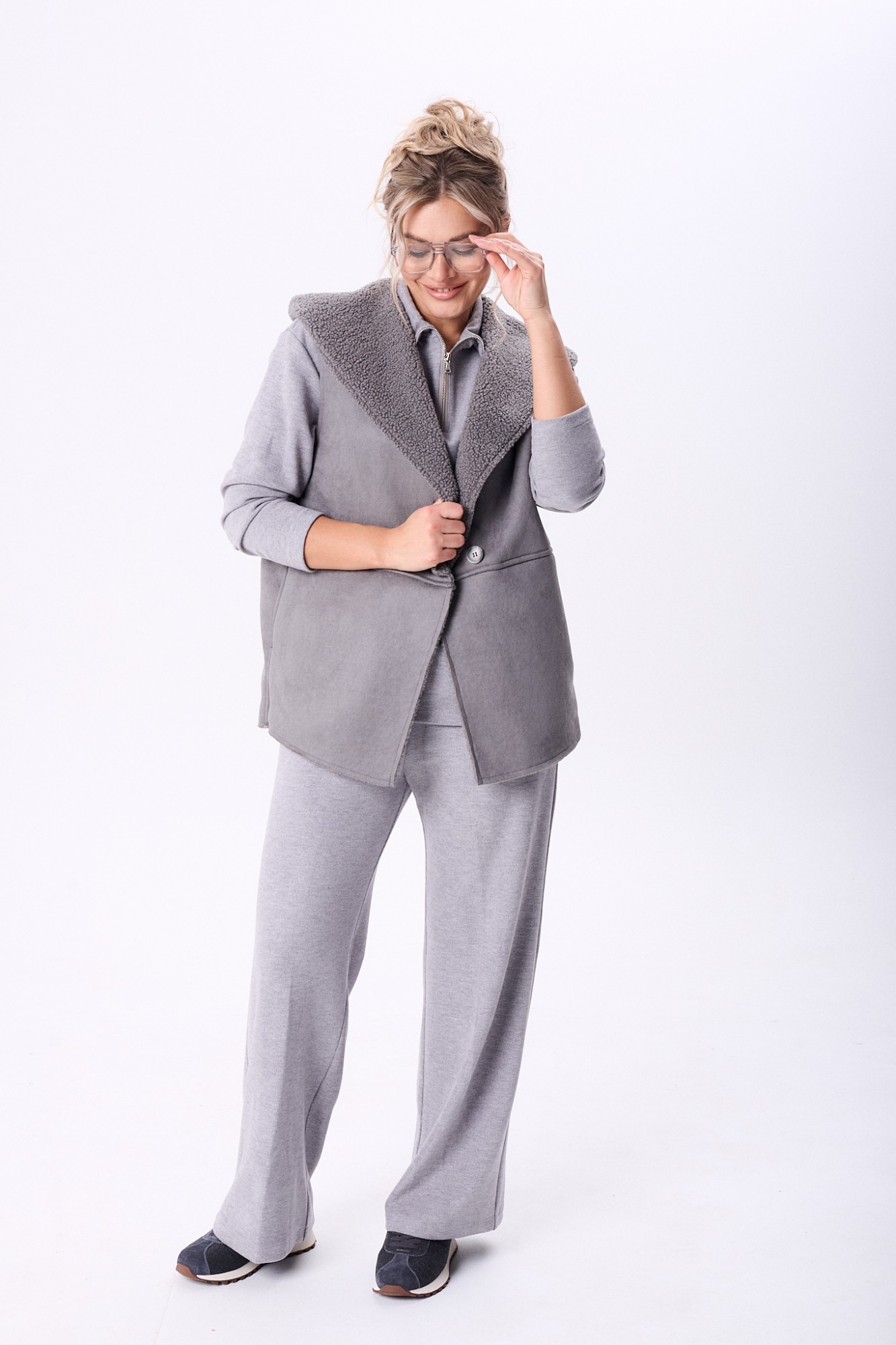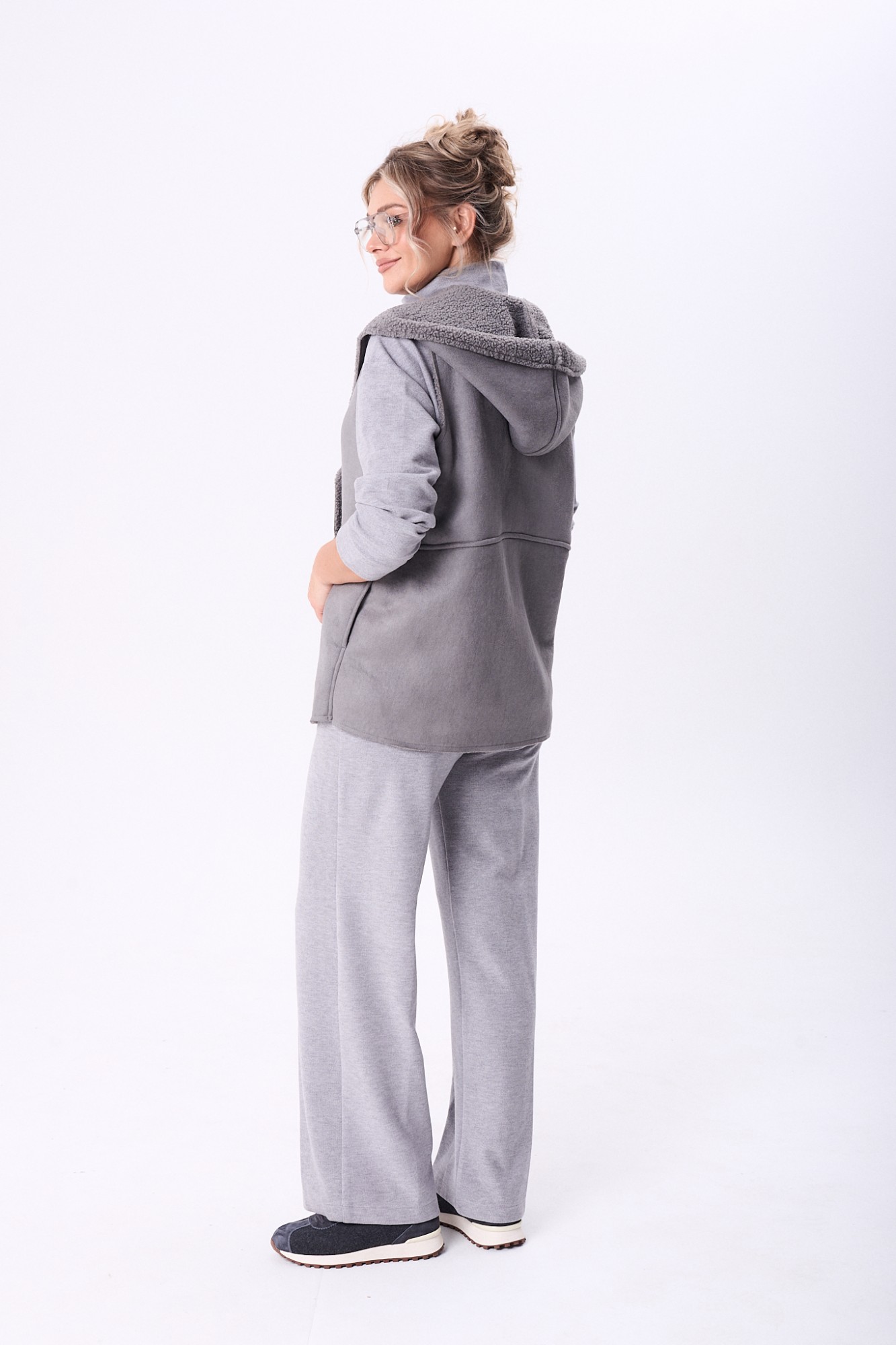 Комплект брючный состоит из кофты, жилетки и брюк. Кофта полуприлегающего силуэта со спущенным плечом, рукав втачной, одношовный. Воротник стойка с застежкой на тесьму-молнию. По боковым швам разрезы. Брюки расширенные книзу, верхний срез обработан поясом с резинкой. В боковых швах карманы. Жилетка свободного кроя со смещенной застежкой на петлю и пуговицу. По спинке горизонтальный рельефный шов на перед, в котором обработаны карманы. Цельнокроеный капюшон с центральной частью. В качестве отделки используется фурнитура.