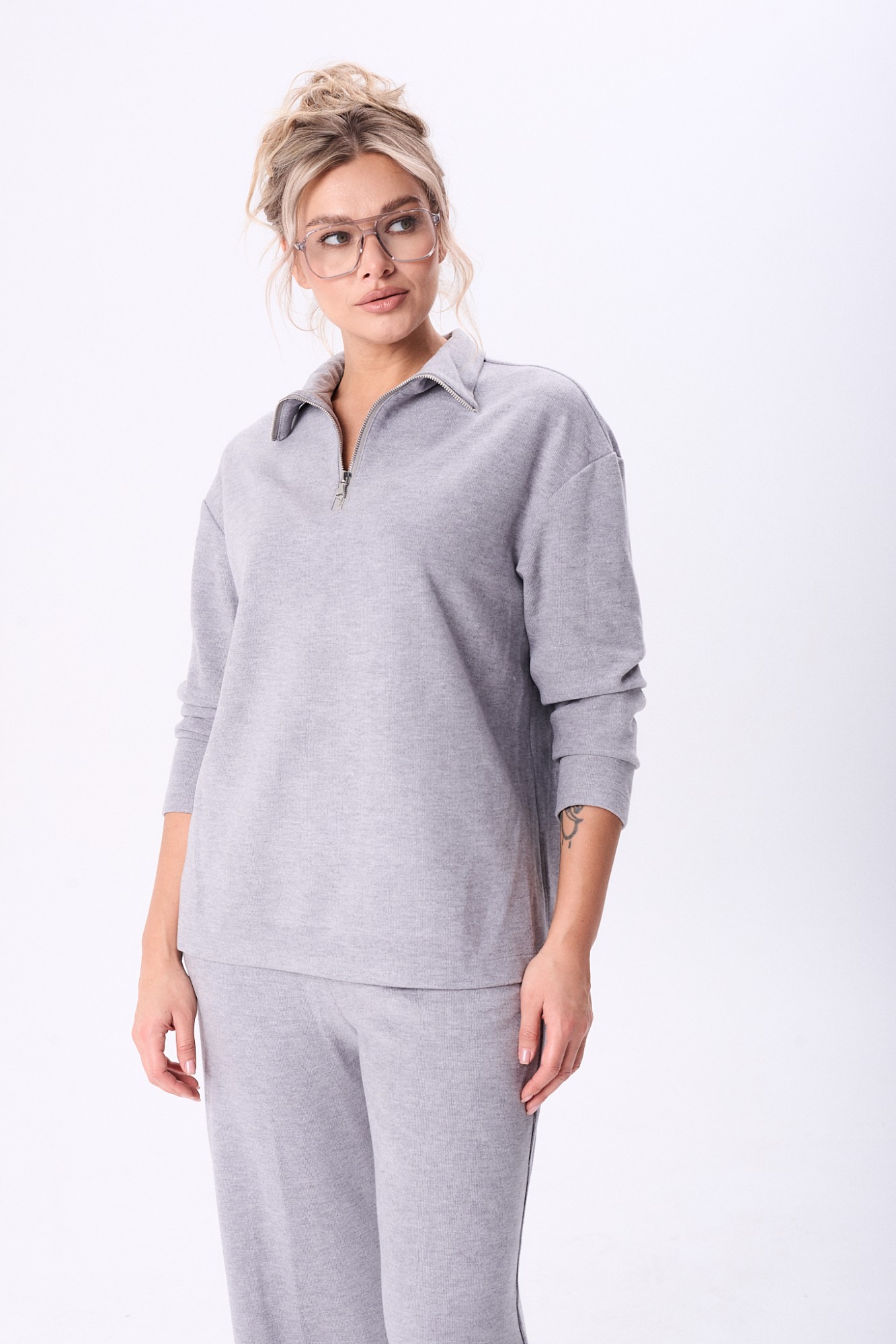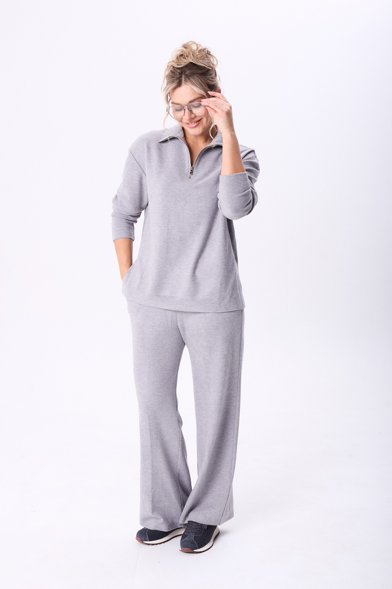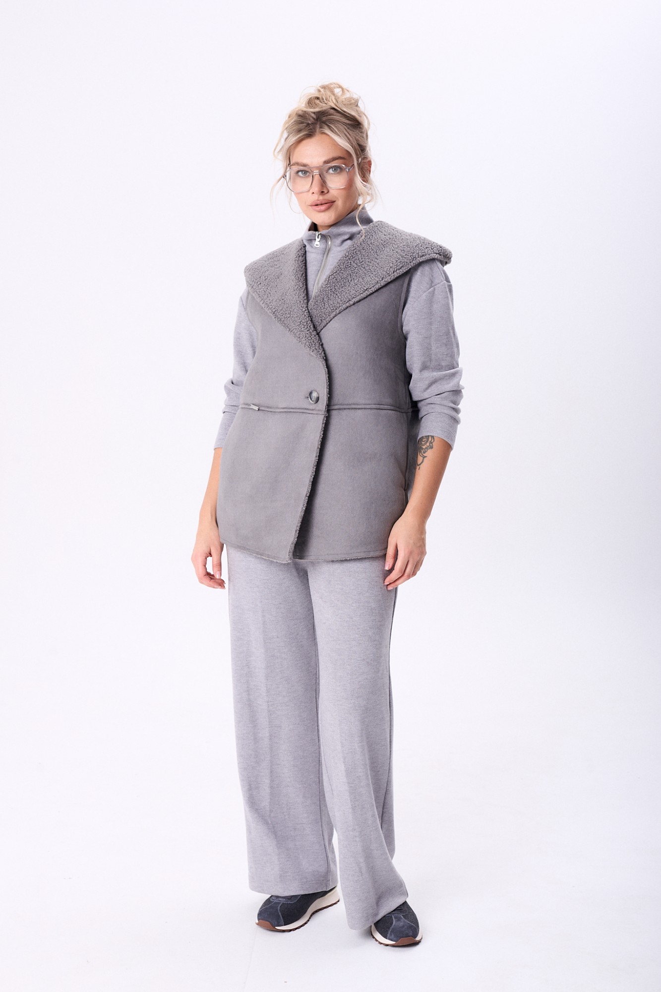 Комплект брючный состоит из кофты, жилетки и брюк. Кофта полуприлегающего силуэта со спущенным плечом, рукав втачной, одношовный. Воротник стойка с застежкой на тесьму-молнию. По боковым швам разрезы. Брюки расширенные книзу, верхний срез обработан поясом с резинкой. В боковых швах карманы. Жилетка свободного кроя со смещенной застежкой на петлю и пуговицу. По спинке горизонтальный рельефный шов на перед, в котором обработаны карманы. Цельнокроеный капюшон с центральной частью. В качестве отделки используется фурнитура.