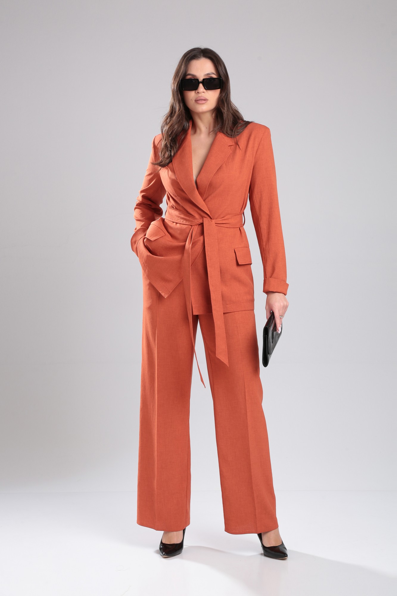 Летний брючный комплект из облегченной костюмной ткани “Лён-Вишер”. Жакет двубортный с застежкой на петли, пуговицы, под пояс (пояс в комплекте), рукав втачной с отворотом, по полочкам прорезные карманы с клапаном и обтачкой. Брюки свободного силуэта «ПАЛАЦЦО» с карманами, застежка молния.