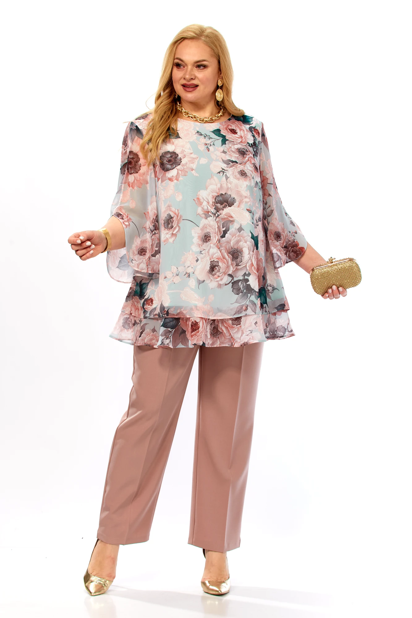 Блузка – полиэстер 100% (шифон). Брюки – полиэстер 50%, вискоза 50%