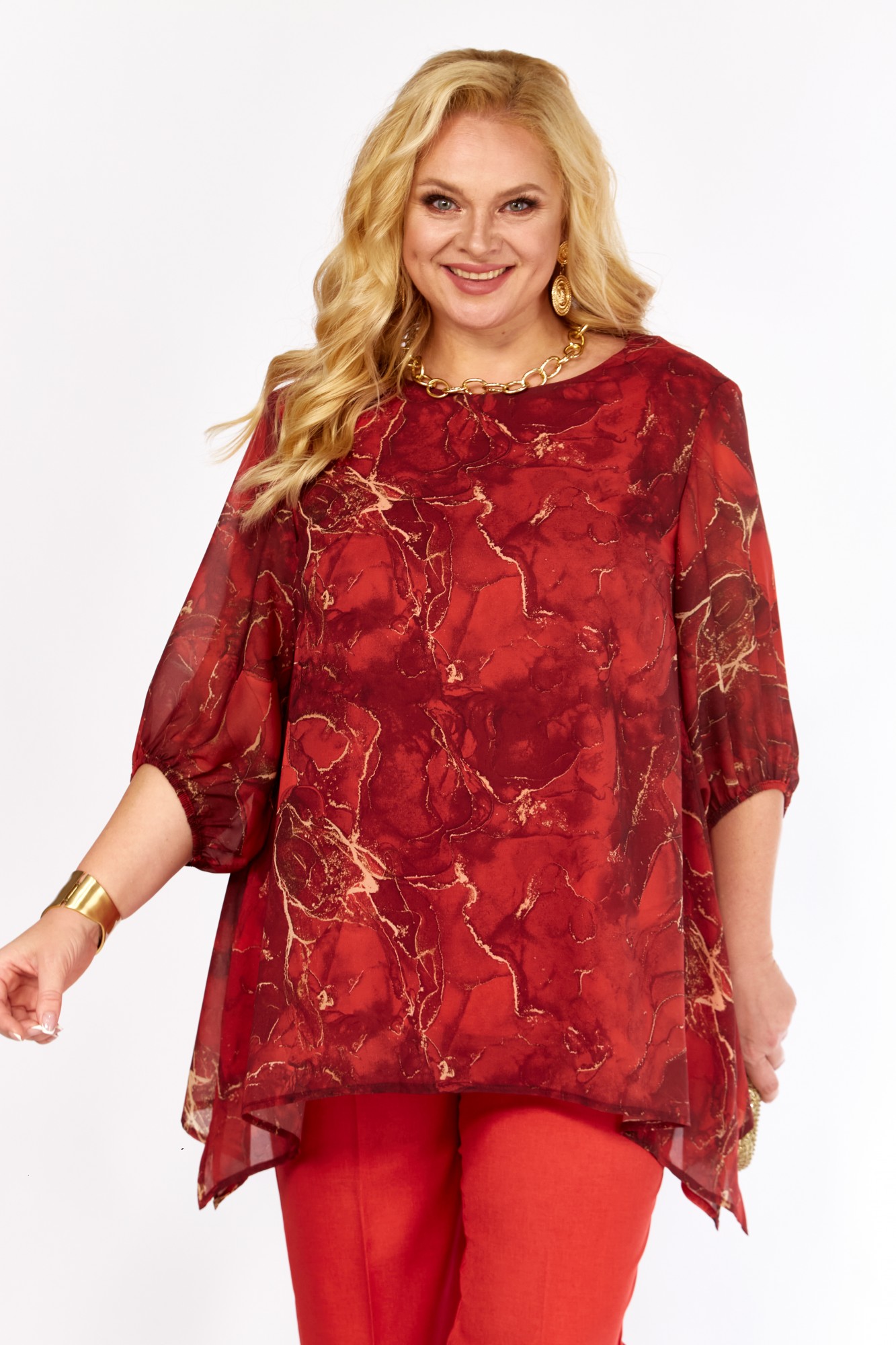 Брючный комплект предназначен для элегантных женщин. Блуза сводного кроя из принтованного шифона, что придает уникальность стилю своими красками. На полочке нагрудные вытачки, вырез горловины аккуратной округлой формы. Рукав втачной, свободный, низ присборен. Брюки слегка зауженные к низу. Пояс притачной, частично на резинке.