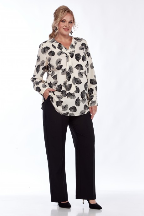 Комплект 2-х предметный, состоит из блузки и брюк. Блузка прямого силуэта из легкой принтованной ткани с красивым цветовым акцентом, эффектно подчеркнет выгодные линии фигуры. V-образная горловина и оригинальный галстук, который одновременно служит декоративным элементом, придавая легкость изделию. Рукав втачной, полной длины, по низу рукава притачная манжета на петли-пуговицы. Низ блузы скруглен к боковому шву. Брюки прямые, слегка зауженные к низу. Пояс притачной, частично на резинке. Застежка спереди брюки на тесьму-молнию, петлю-пуговицу.