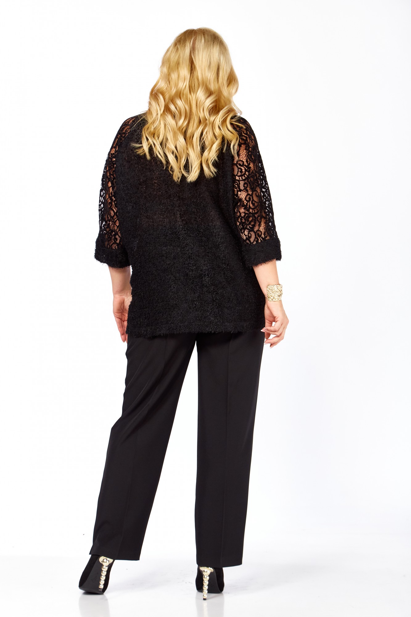 Комплект женский брючный 2-х предметный. Праздничная элегантная блузка полуприлегающего силуэта, выглядит эффектно, прекрасно подойдет для вечерних мероприятий. Горловина аккуратной округлой формы. Рукав выполнен из мягкого кружева, что придает дополнительный шарм, длина 7/8. В боковых швах предусмотрены разрезы. Брюки с заутюженными стрелками слегка зауженные к низу. Пояс притачной, частично на резинке.