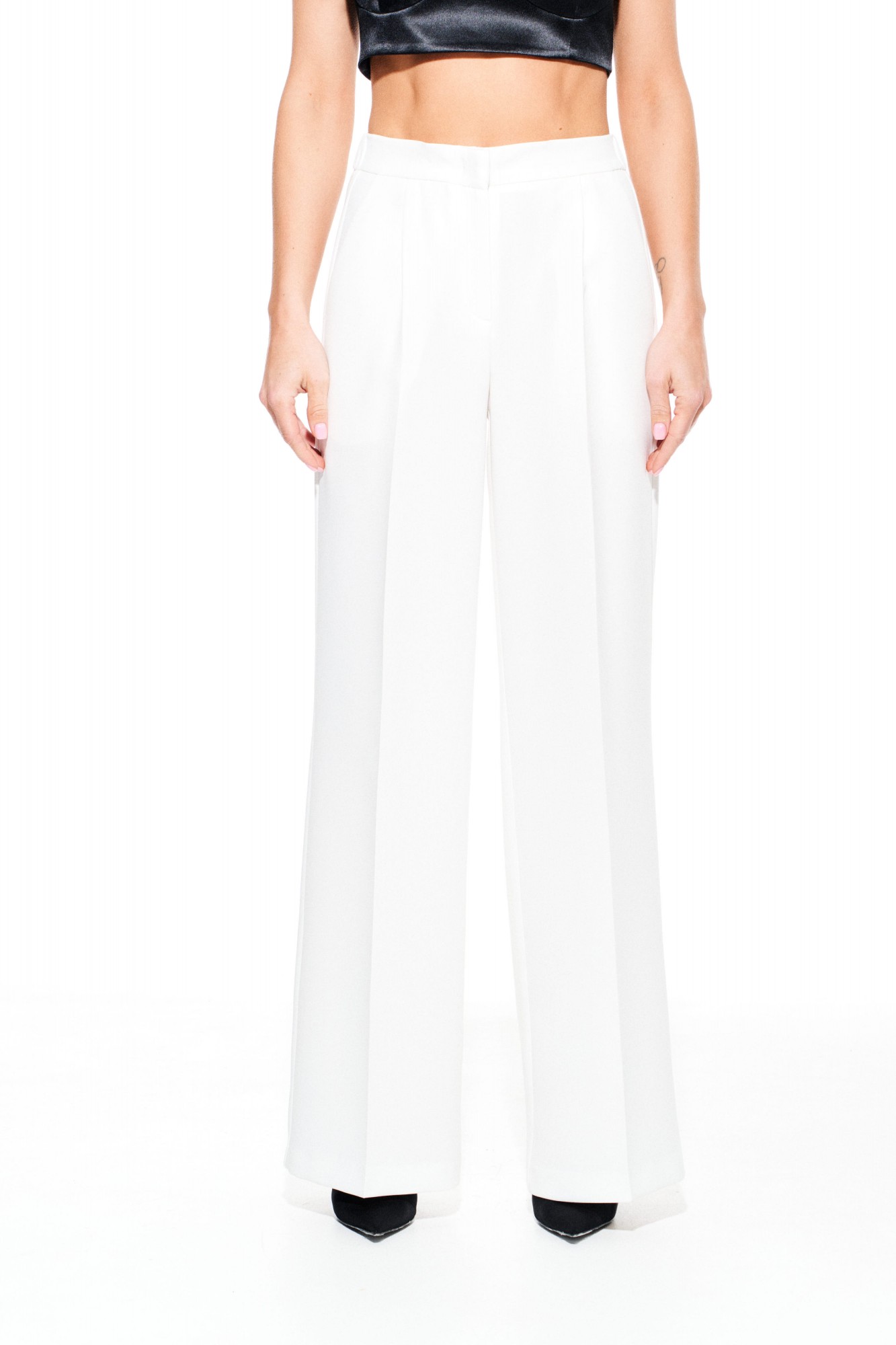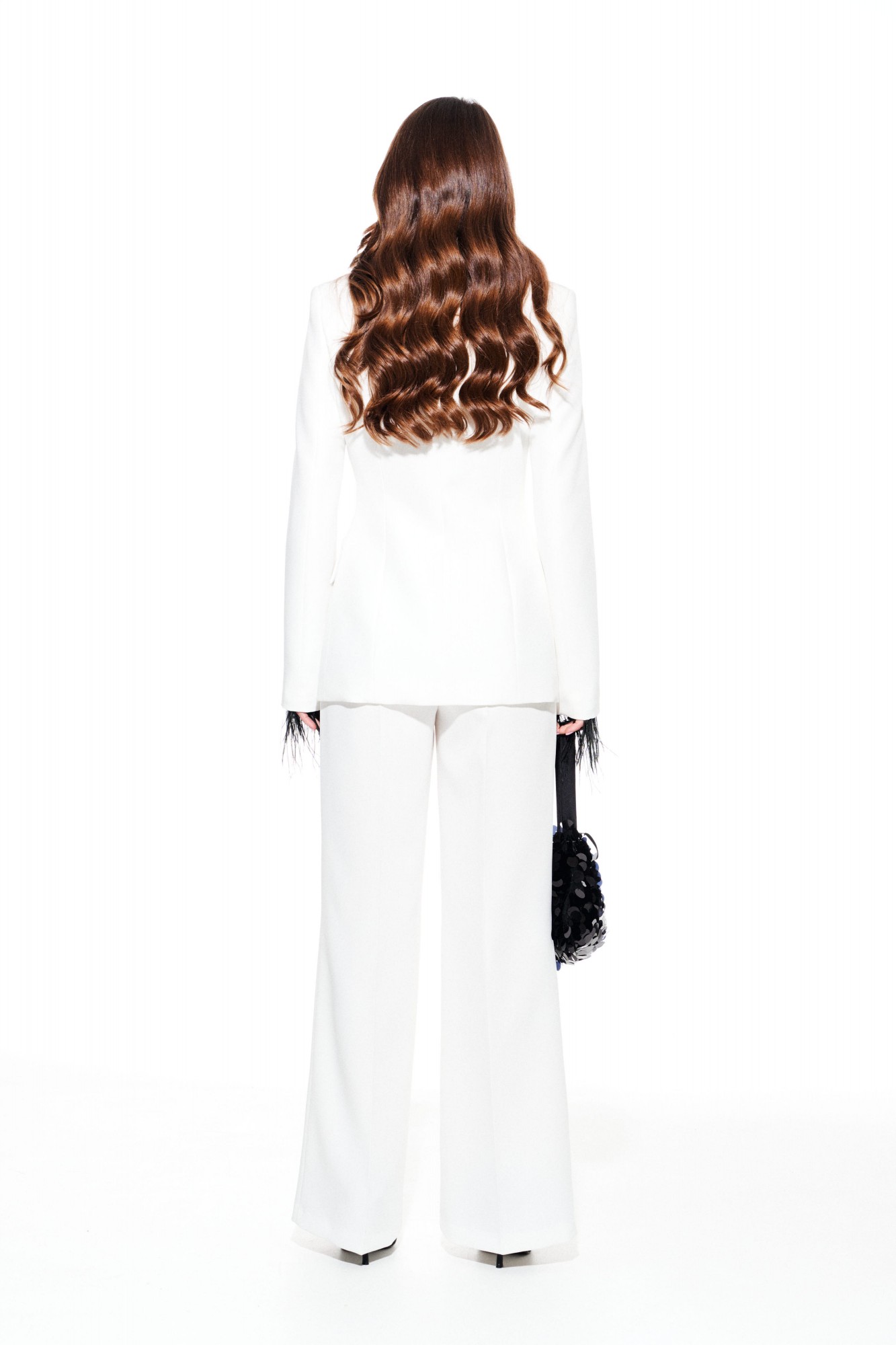 Костюм из костюмно-плательной ткани, 2-х предметный, состоящий из жакета и брюк. Жакет приталенного силуэта, с отложным воротником и лацканами пиджачного типа, с центральной застежкой на 3 навесные петли и 3 пуговицы, на подкладке. Перед отрезной, с рельефами, нагрудными вытачками, имитацией кармана с клапаном. Спинка со средним швом и рельефами. Рукав втачной, двухшовный, длинный. Низ рукава со съемной тесьмой из перьев. Брюки умеренного объема, прямого силуэта. На передних и задних половинках заутюжены стрелки. На передних половинках выполнены односторонние складки и боковые карманы с отрезным бочком. Задние половинки с таллиевыми вытачками. Застежка – гульфик на молнии. Пояс притачной, с резинкой по спинке, застежкой на крючок и потайную пуговицу.