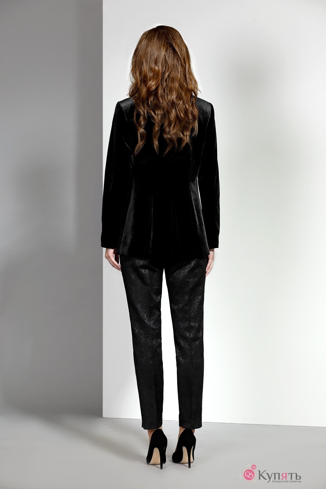 жакет: ПЭ - 80%,ВИС-15%, ПУ - 5%; брюки: хлопок - 68%, ПЭ - 28%, ПУ - 4%; блузка: ПЭ - 80%, вискоза - 17%, ПУ -3%