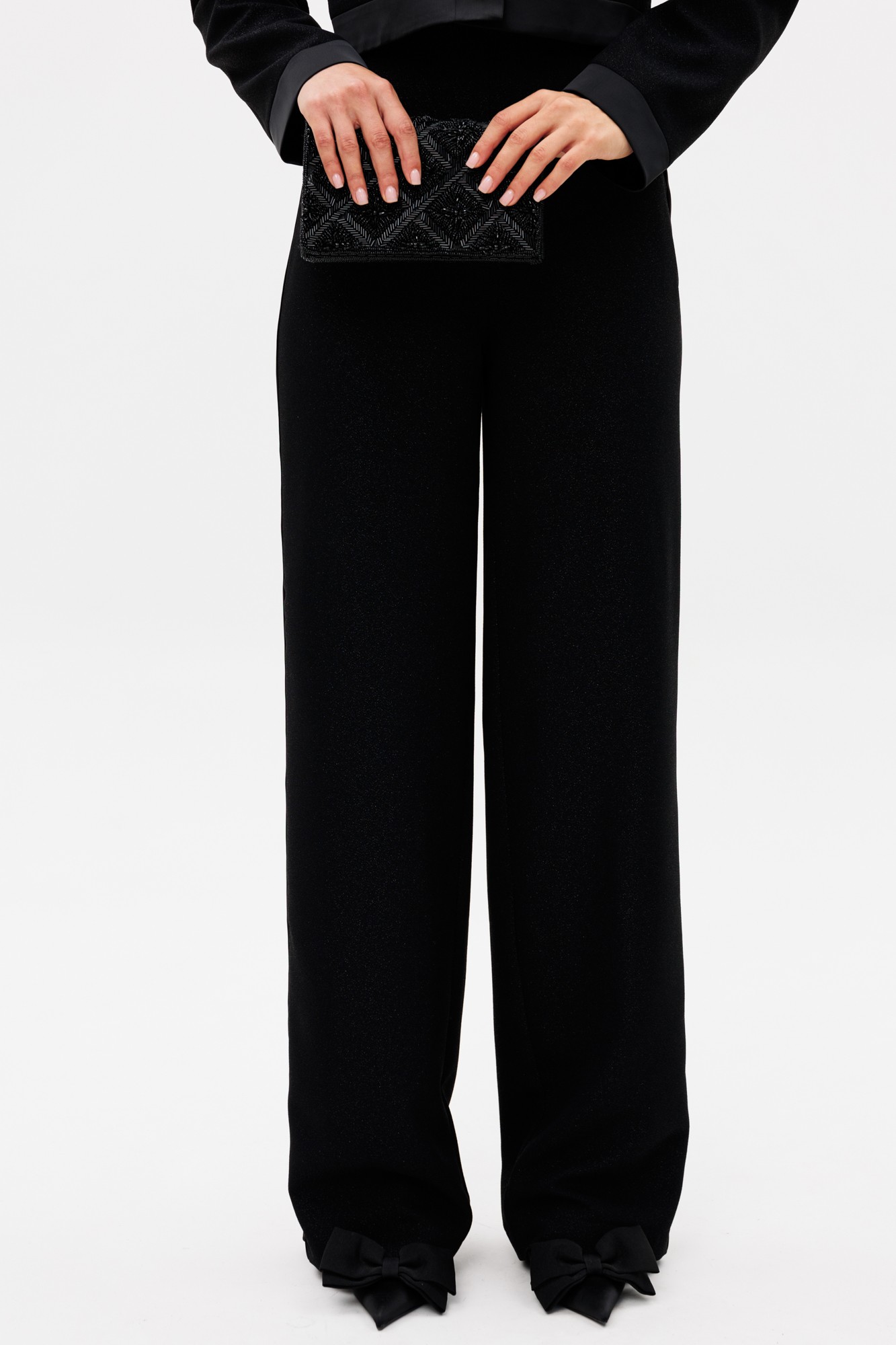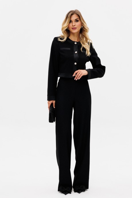 Комплект: жакет + брюки. Комплект выполнен из костюмной ткани с блеском. Жакет прямого силуэта, до линии талии. Спереди рельефные декоративные карманы, застежка на пуговицы. На спинке средний шов. Горловина округлой формы. Край борта и низ жакета обработаны планкой из отделочной ткани. Рукав втачной, двухшовный. Жакет на притачной по низу подкладке. Брюки прямого силуэта, длиной до пола, без пояса. По боковым швам лампасы из атласа. Сзади в среднем шве застежка на потайную молнию.