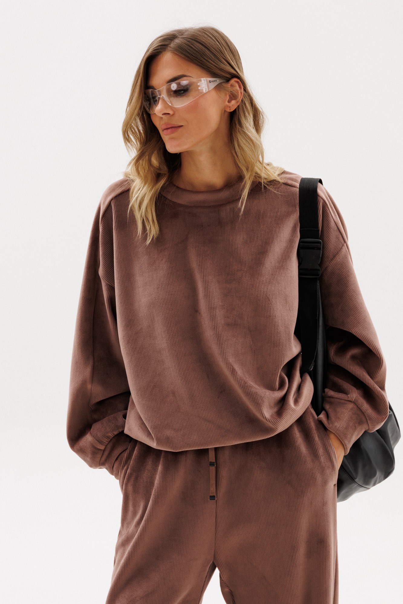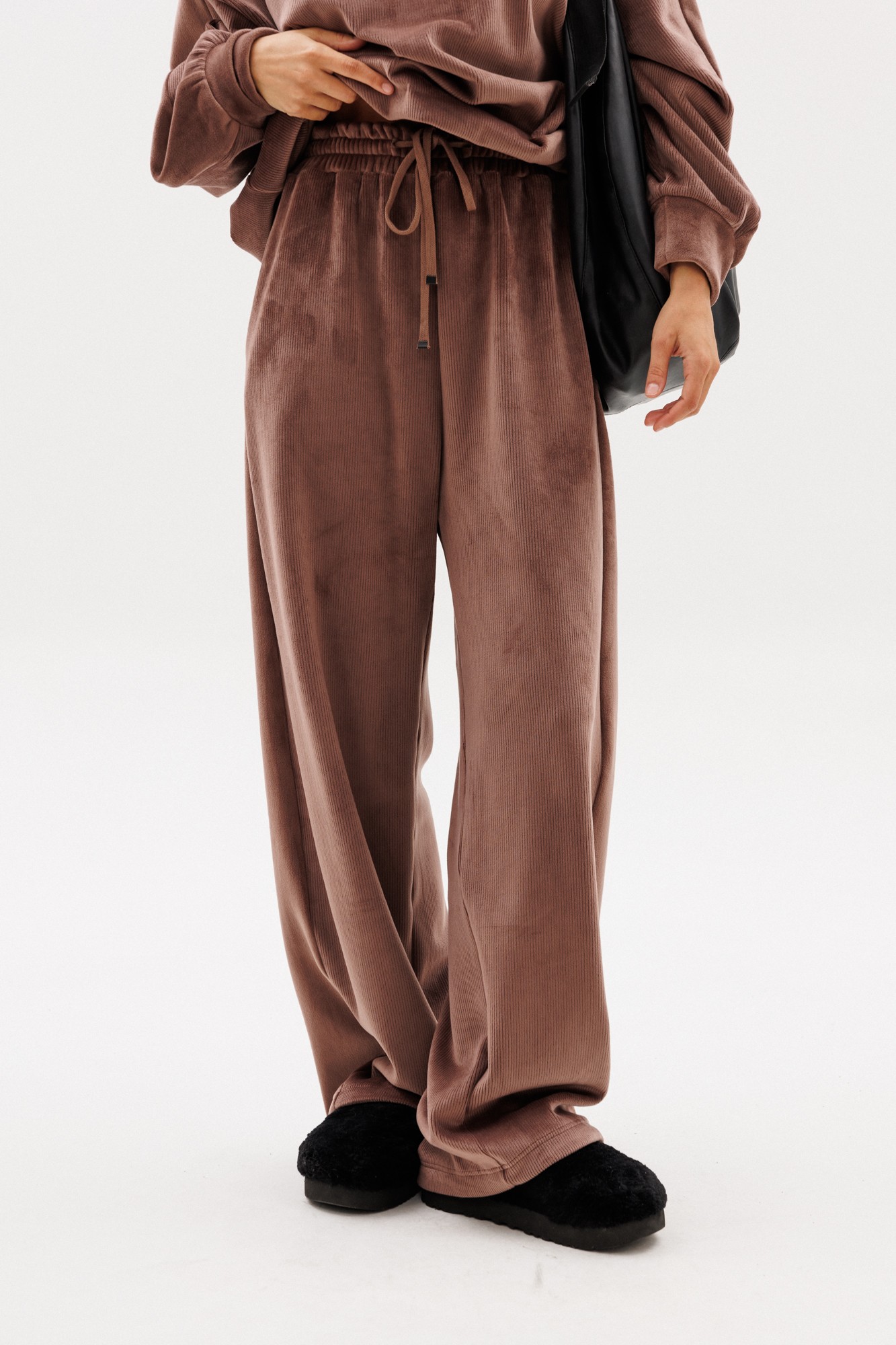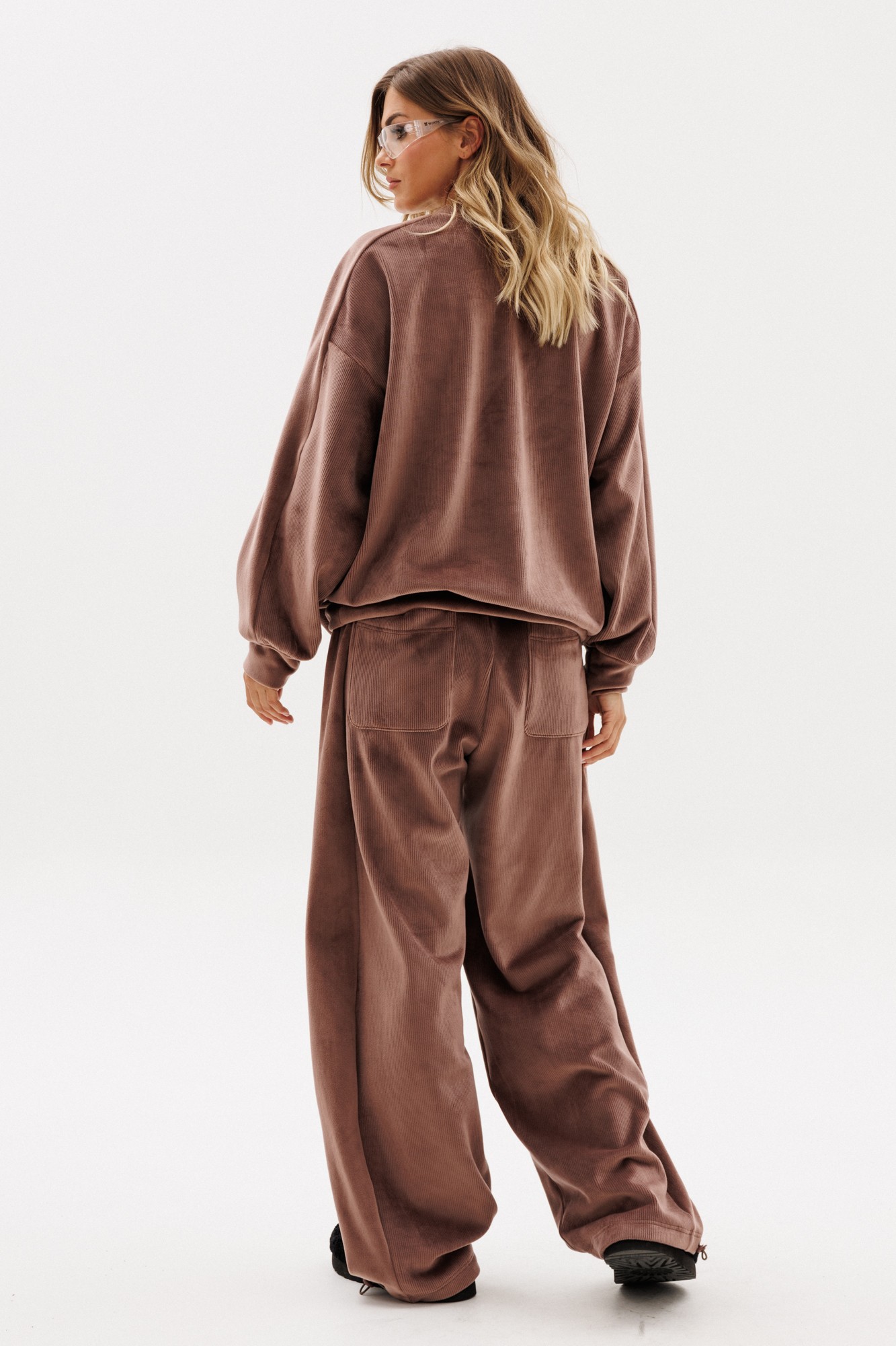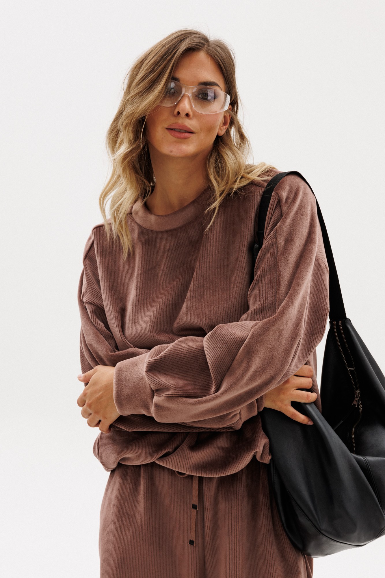 Комплект: джемпер+брюки. Комплект выполнен из двустороннего велюра в мелкий рубчик. Джемпер О-образного силуэта, покроя ""oversize"", длиной до линии бедер. Перед и спинка цельные. Горловина округлой формы, обработана бейкой. Плечевой шов удлинен. Рукав рубашечного покроя, одношовный. Низ рукава на манжете. Верхняя часть рукава переходит в кокетку переда т спинки и доходит до горловины. По низу джемпера обработан пояс. Пояс, манжеты, верхняя часть рукава и бейка горловины выполнены из основной, но без рубчика. Брюки на притачном поясе с эластичной тесьмой, прямого силуэта, длиной в пол, покроя ""oversize"". Боковой шов заменен лампасом. В швах лампаса карманы. Сзади накладные карманы. В пояс протянут шнур с наконечниками. По низу брюк втянута эластичная тесьма с фиксаторами. Лампасы и пояс выполнены из основной ткани, но без рубчика.