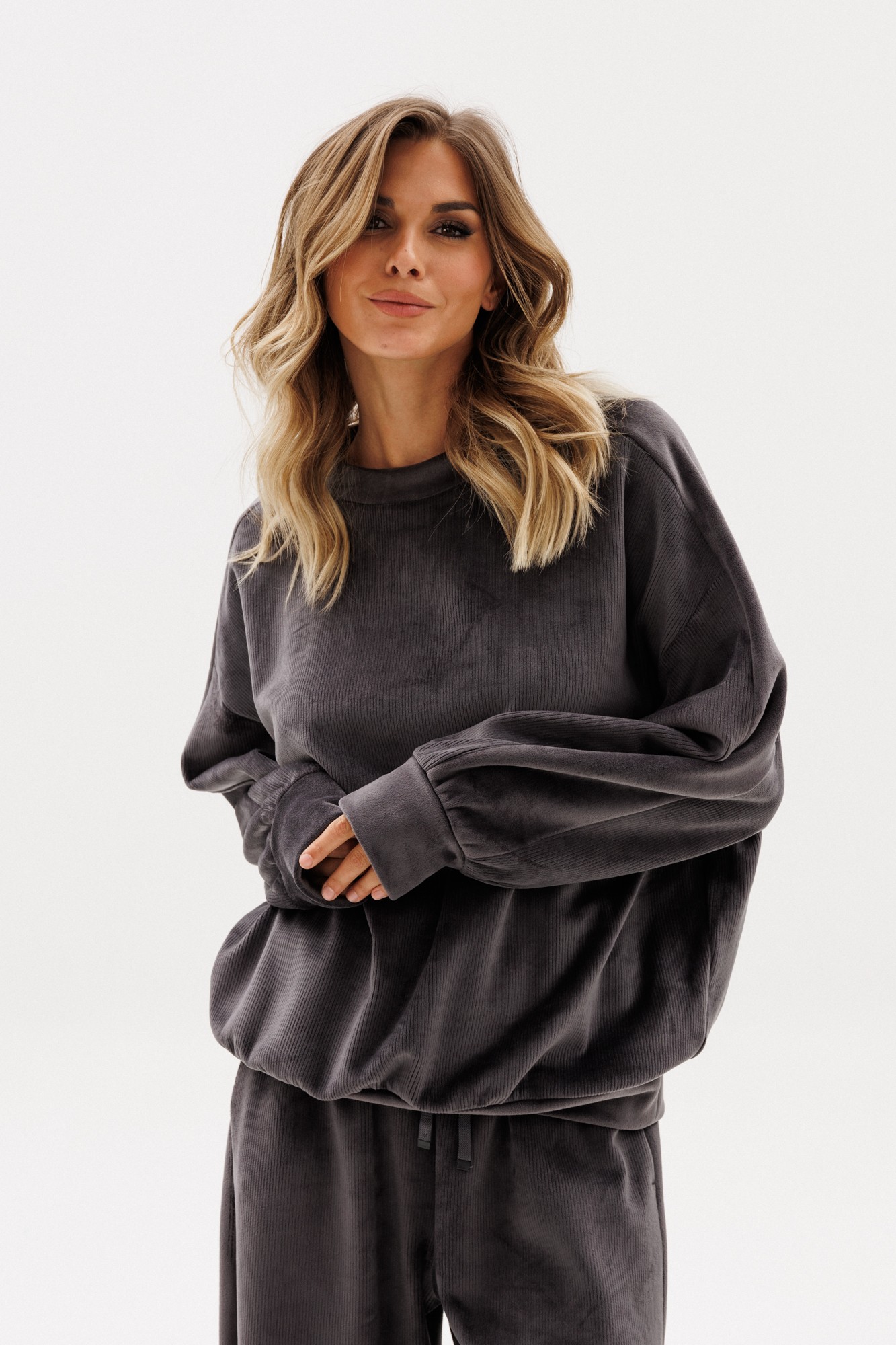 Комплект: джемпер+брюки. Комплект выполнен из двустороннего велюра в мелкий рубчик. Джемпер О-образного силуэта, покроя ""oversize"", длиной до линии бедер. Перед и спинка цельные. Горловина округлой формы, обработана бейкой. Плечевой шов удлинен. Рукав рубашечного покроя, одношовный. Низ рукава на манжете. Верхняя часть рукава переходит в кокетку переда т спинки и доходит до горловины. По низу джемпера обработан пояс. Пояс, манжеты, верхняя часть рукава и бейка горловины выполнены из основной, но без рубчика. Брюки на притачном поясе с эластичной тесьмой, прямого силуэта, длиной в пол, покроя ""oversize"". Боковой шов заменен лампасом. В швах лампаса карманы. Сзади накладные карманы. В пояс протянут шнур с наконечниками. По низу брюк втянута эластичная тесьма с фиксаторами. Лампасы и пояс выполнены из основной ткани, но без рубчика.