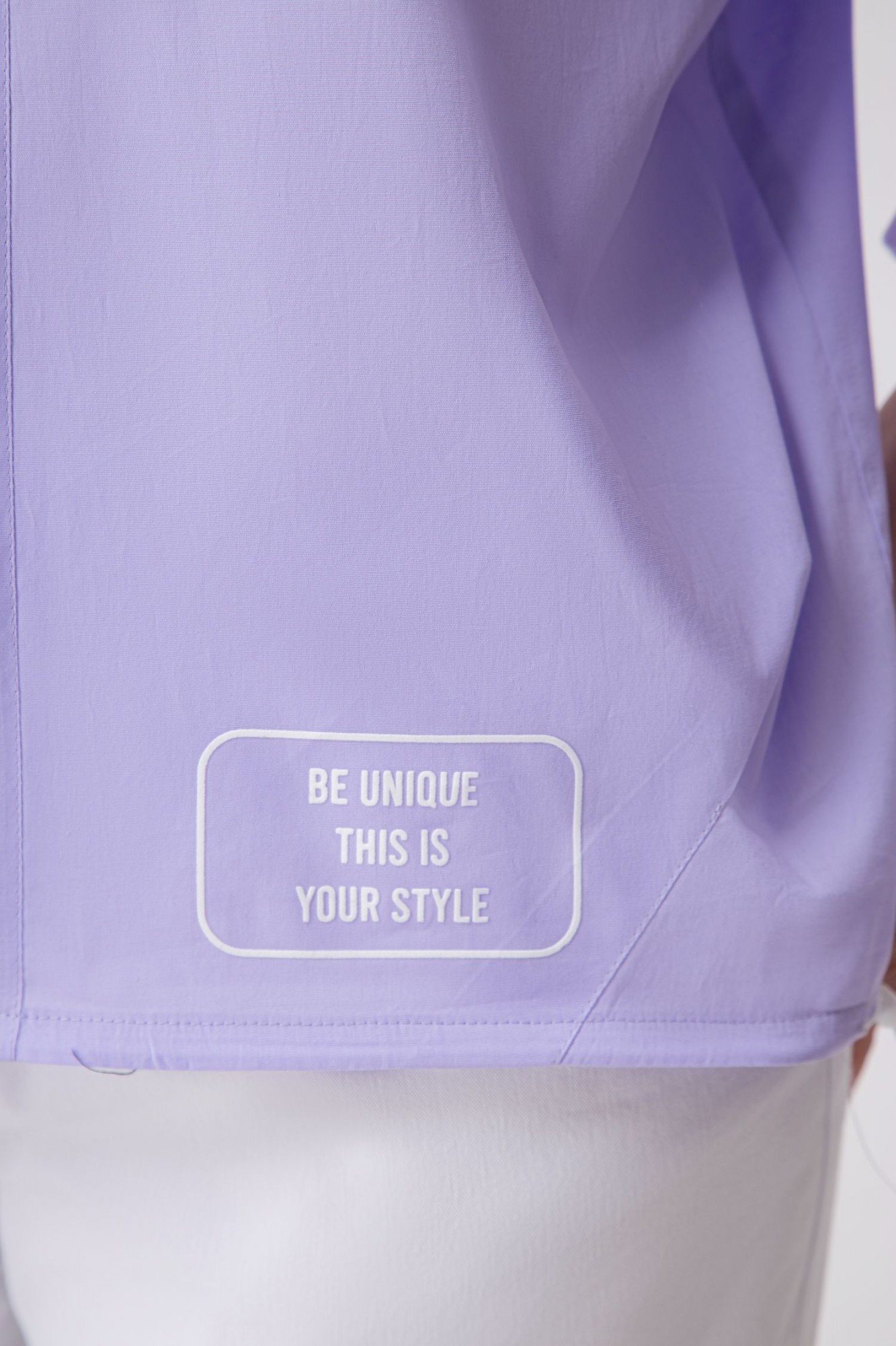Комплект женский 2-хпредметный, состоящий из блузы и брюк. Блуза прямого силуэта со спущенным плечом выполнена из хлопка, вырез горловины v-образный со стойкой, рукав втачной по низу со сборкой на приточном манжете, по спинке имитация потайной застёжки, по низу блузы втянута кулиса фиксирующая ширину блузы. Декором служит отделочная печать на полочке блузы Брюки женские на притачном поясе, джогеры зауженные к низу, выполнены из хлопкового джинса. Пояс на широкой резинке со шнуром и наконечниками, по центру передних половинок имитация застёжки и карманы, по задним половинкам кокетка и накладные карманы.