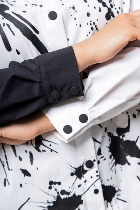Комплект женский двухпредметный , состоящий из блузы и брюк. Блуза женская полуприлегающего силуэта выполнена из хлопковой ткани. Застежка центральная на кнопки, воротник на стойке рубашечного типа, рукав втачной, по низу на притачной манжете. Декором служит обьемый принт по полочкам. Брюки женские на притачном поясе, выполнены из искуственной кожи-стрейч. Застежка центральная на молнию и пуговицу. В боковы швах обработаы карманы, на задней половике брюк имитация карманов. Низ брюк притачая манжета на широкой резинке. По талии частичная резинка на поясе.