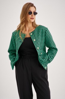 Костюм из жакета-бомбера черно-зеленой гусь-лапки и брюками-бананами (слоучи) может стать идеальной базой для офисного образа